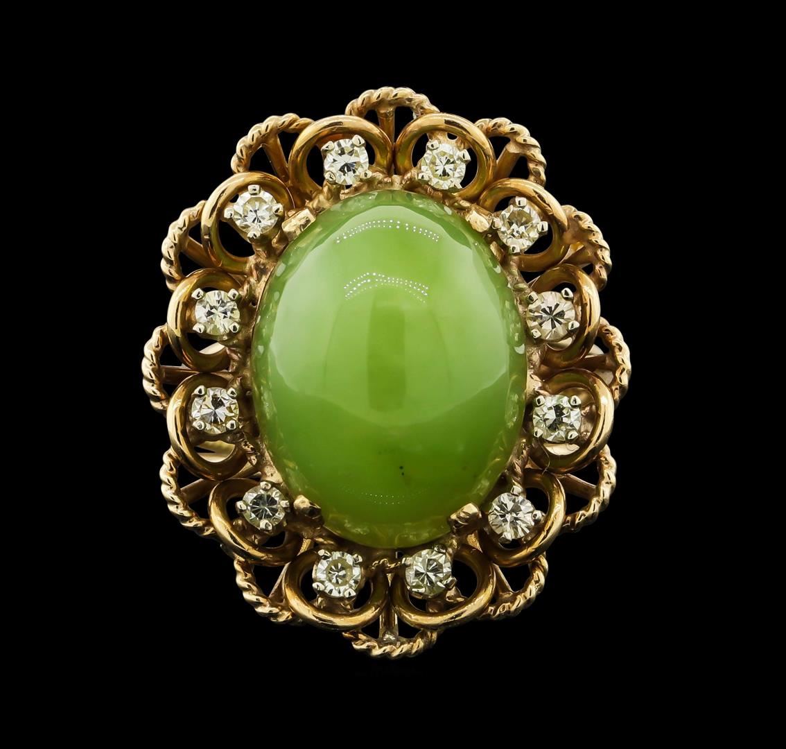 One 14K Yellow Gold Jade and Diamond Ring. The ring contains (1) Jade center stone, and (12) Brilliant Round Cut Diamonds weighing approximately 0.24ctw. The total weight of the ring is 8.8 grams.
