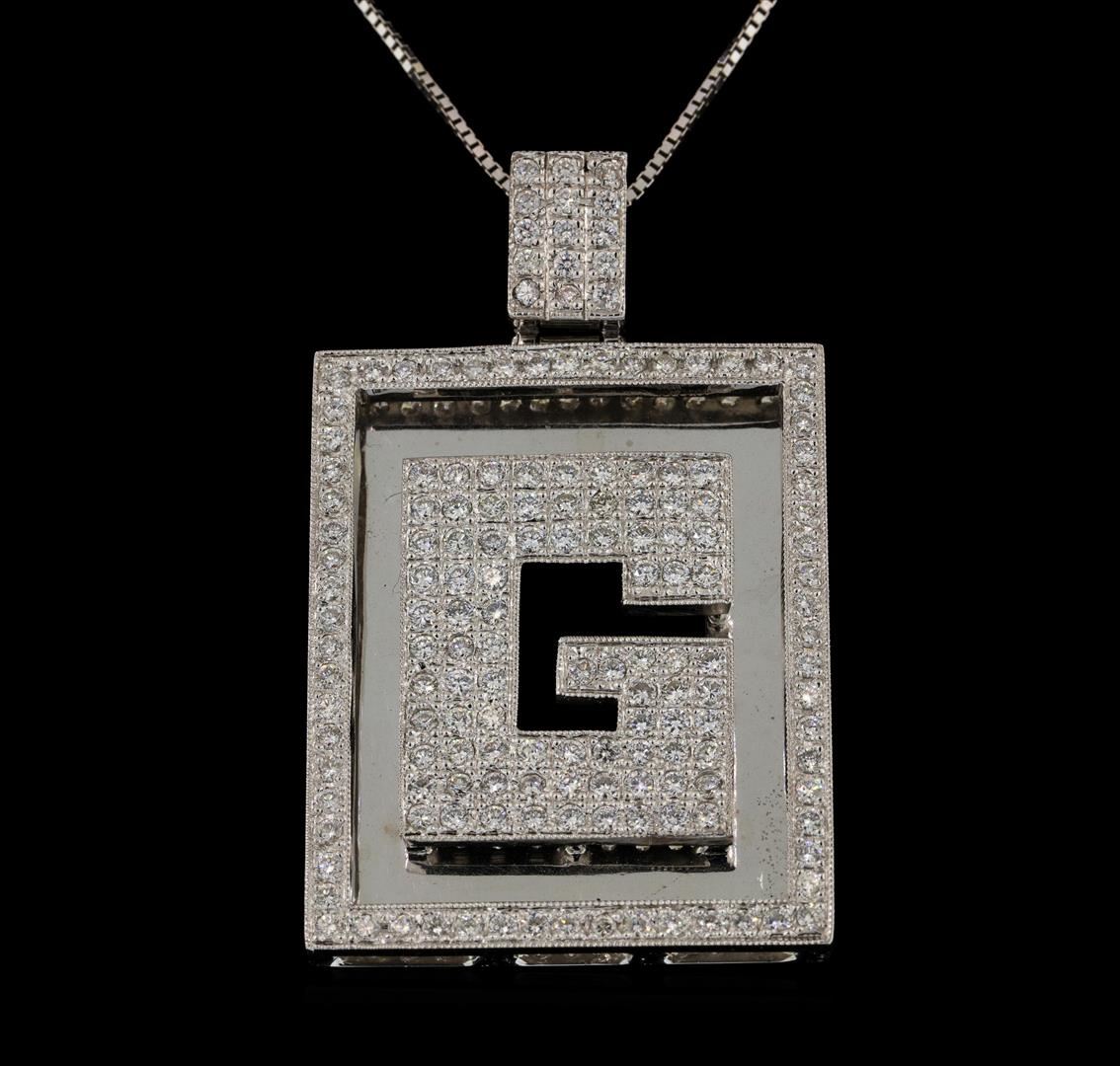 One electronically tested 14-18KT white gold lady's combination cast & assembled fashion pendant & chain 16.0" long, 1 box link with a lobster claw clasp with a bright polish with milgrain detailing finish. The featured lady's pendant is cast in 18KT white gold and features a framed letter "G" motif, and is attached to a 14KT white gold chain. Identified with markings of "18K". Condition is new, good workmanship. Containing: One Hundred Fifty-Eight bead set round brilliant cut diamonds, measuring 1.85 - 1.75 x 1.12mm (depth est.) approximate total weight of 158 Stones = 3.50ct. Graded in the setting. Color G - I Clarity SI-1 to SI-2 Cut Good. Total Weight of Diamonds 3.50ct. Total Weight of Pendant & Chain 32.40gm. GAS Appraised.