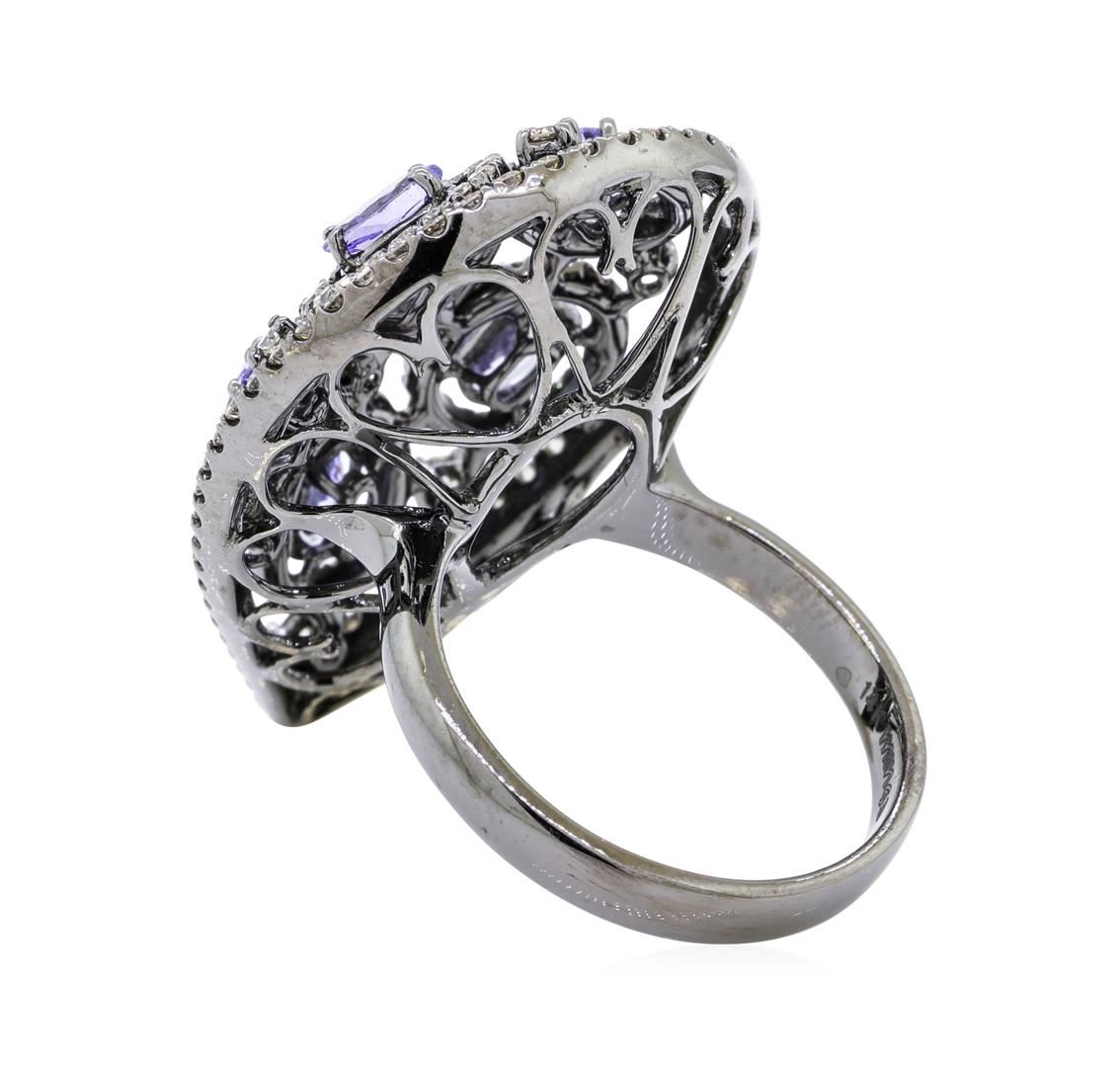 One electronically tested 14KT black rhodium gold lady's cast fashion cocktail ring with a bright polish finish. The featured lady's ring has a shank measuring 2.95 millimeters wide. Identified with markings of '14K'. Condition is new, good workmanship. Containing: Six prong set oval modified mixed cut natural tanzanites, measuring 5.20 x 3.00 x 2.00mm, (depth est.) approximate total weight of 1.32ct., clarity is eye clean, medium light, very slightly grayish, violetish blue color, (GIA vB 4/3), cut is good. Graded in the setting. Seven prong set round brilliant cut diamonds, measuring 1.70 - 1.60 x 1.02mm (depth est.) approximate total weight of 7 Stones = 0.12ct. Graded in the setting. Color H - I Clarity VS-2 to SI-1 Cut Very Good One Hundred Forty-Nine prong set round brilliant cut diamonds, measuring 1.40 - 1.30 x 0.84mm (depth est.) approximate total weight of 149 Stones = 1.40ct. Graded in the setting. Color H - I Clarity VS-2 to SI-1 Cut Very Good. Total Weight of Colored Stones 1.32ct.. Total Weight of Diamonds 1.52ct.. Total Weight of Ring 9.50gm. GAS Appraised.