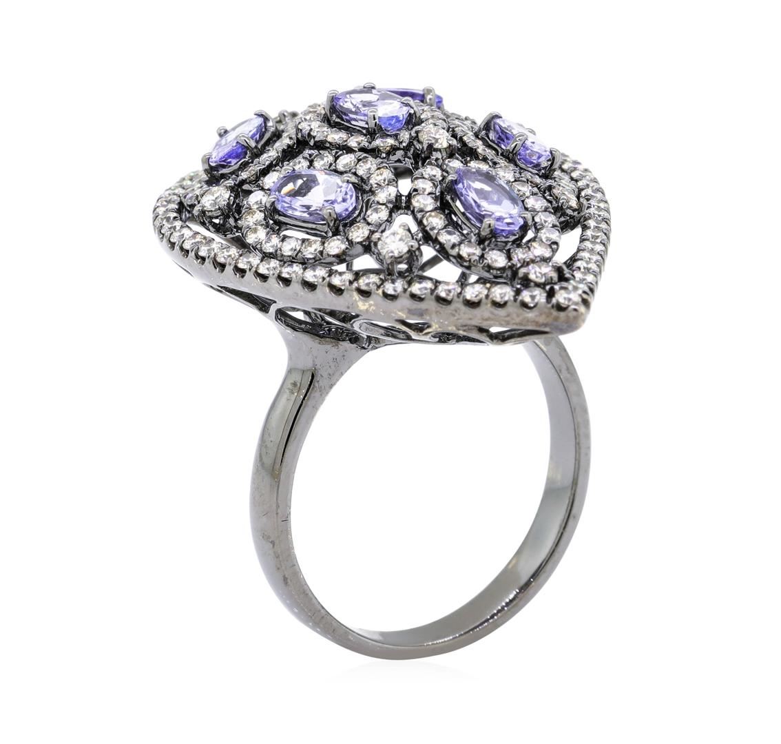 One electronically tested 14KT black rhodium gold lady's cast fashion cocktail ring with a bright polish finish. The featured lady's ring has a shank measuring 2.95 millimeters wide. Identified with markings of '14K'. Condition is new, good workmanship. Containing: Six prong set oval modified mixed cut natural tanzanites, measuring 5.20 x 3.00 x 2.00mm, (depth est.) approximate total weight of 1.32ct., clarity is eye clean, medium light, very slightly grayish, violetish blue color, (GIA vB 4/3), cut is good. Graded in the setting. Seven prong set round brilliant cut diamonds, measuring 1.70 - 1.60 x 1.02mm (depth est.) approximate total weight of 7 Stones = 0.12ct. Graded in the setting. Color H - I Clarity VS-2 to SI-1 Cut Very Good One Hundred Forty-Nine prong set round brilliant cut diamonds, measuring 1.40 - 1.30 x 0.84mm (depth est.) approximate total weight of 149 Stones = 1.40ct. Graded in the setting. Color H - I Clarity VS-2 to SI-1 Cut Very Good. Total Weight of Colored Stones 1.32ct.. Total Weight of Diamonds 1.52ct.. Total Weight of Ring 9.50gm. GAS Appraised.