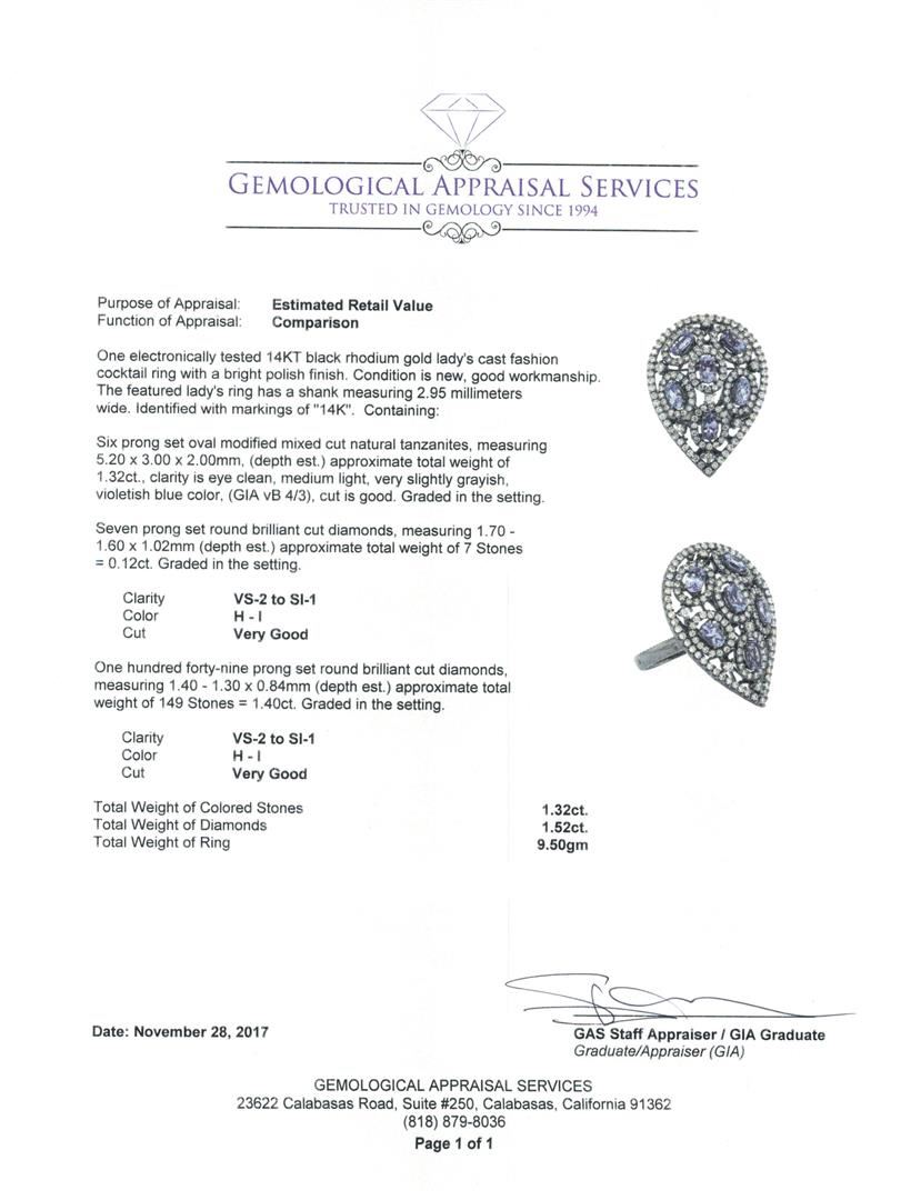 One electronically tested 14KT black rhodium gold lady's cast fashion cocktail ring with a bright polish finish. The featured lady's ring has a shank measuring 2.95 millimeters wide. Identified with markings of '14K'. Condition is new, good workmanship. Containing: Six prong set oval modified mixed cut natural tanzanites, measuring 5.20 x 3.00 x 2.00mm, (depth est.) approximate total weight of 1.32ct., clarity is eye clean, medium light, very slightly grayish, violetish blue color, (GIA vB 4/3), cut is good. Graded in the setting. Seven prong set round brilliant cut diamonds, measuring 1.70 - 1.60 x 1.02mm (depth est.) approximate total weight of 7 Stones = 0.12ct. Graded in the setting. Color H - I Clarity VS-2 to SI-1 Cut Very Good One Hundred Forty-Nine prong set round brilliant cut diamonds, measuring 1.40 - 1.30 x 0.84mm (depth est.) approximate total weight of 149 Stones = 1.40ct. Graded in the setting. Color H - I Clarity VS-2 to SI-1 Cut Very Good. Total Weight of Colored Stones 1.32ct.. Total Weight of Diamonds 1.52ct.. Total Weight of Ring 9.50gm. GAS Appraised.