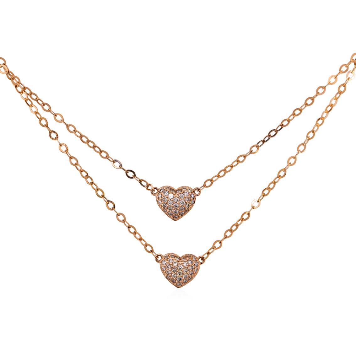 One electronically tested 14KT rose gold lady's combination cast & assembled fashion necklace with a spring ring clasp with a bright polish finish. The featured lady's necklace has two heart shaped motifs and a 1.7 millimeter flat cable link that is adjustable between 16 and 18 inches in length. Identified with markings of "14K". Condition is new, good workmanship. Containing: Sixty pave' set round brilliant cut diamonds, measuring 1.20 - 1.15 x 0.73mm (depth est.) approximate. Total Weight of 60 Stones = 0.38ct. Graded in the setting. Clarity: SI-1 to SI-2. Color: H - I, Cut Good. Total Weight of Diamonds 0.38ct. Total Weight of Necklace 2.70gm. GAS Appraised at $2,440.00.