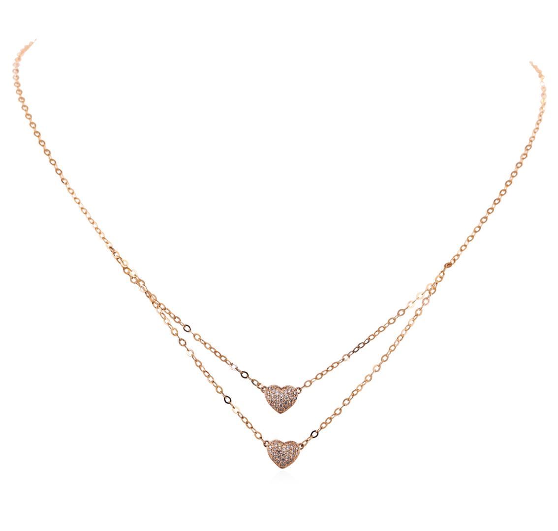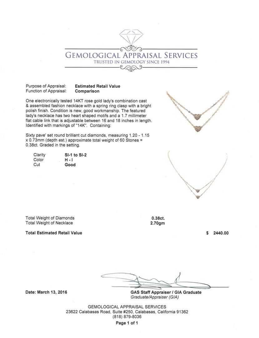One electronically tested 14KT rose gold lady's combination cast & assembled fashion necklace with a spring ring clasp with a bright polish finish. The featured lady's necklace has two heart shaped motifs and a 1.7 millimeter flat cable link that is adjustable between 16 and 18 inches in length. Identified with markings of "14K". Condition is new, good workmanship. Containing: Sixty pave' set round brilliant cut diamonds, measuring 1.20 - 1.15 x 0.73mm (depth est.) approximate. Total Weight of 60 Stones = 0.38ct. Graded in the setting. Clarity: SI-1 to SI-2. Color: H - I, Cut Good. Total Weight of Diamonds 0.38ct. Total Weight of Necklace 2.70gm. GAS Appraised at $2,440.00.