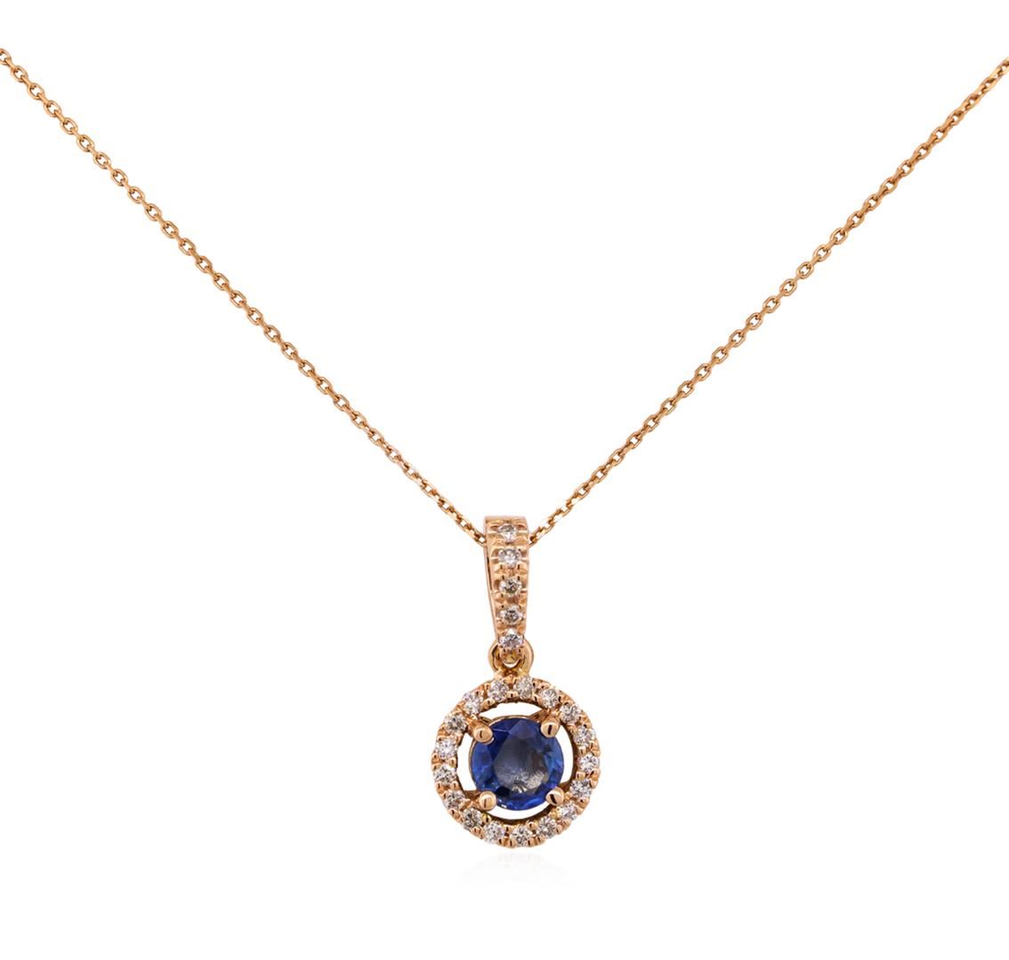 One electronically tested 14KT rose gold lady's combination cast & assembled fashion pendant & chain 16.0" long, 1mm diamond cut cable link with a spring ring clasp with a bright polish finish. Identified with markings of "14K". Condition is new, good workmanship. Containing: One prong set round modified brilliant cut natural blue sapphire, measuring 5.15 - 5.11 x 2.75 mm, approximate weight of 0.58ct., clarity is slightly included, type II, medium light, very slightly grayish, blue color, (GIA B 4/3), Cut is very good. Colored gemstones are presumed to have been subjected to commonly used enhancement processes. Graded in the setting. Twenty-Three prong set round brilliant cut diamonds, measuring 1.40 - 1.35 x 0.86mm (depth est.) approximate. Total Weight of 23 Stones = 0.23ct. Graded in the setting. Clarity: VS-2 to SI-1. Color: H - I, Cut Good. Total Weight of Colored Stones 0.58ct. Total Weight of Diamonds 0.23ct. Total Weight of Pendant & Chain 2.30gm. GAS Appraised at $1,360.00.