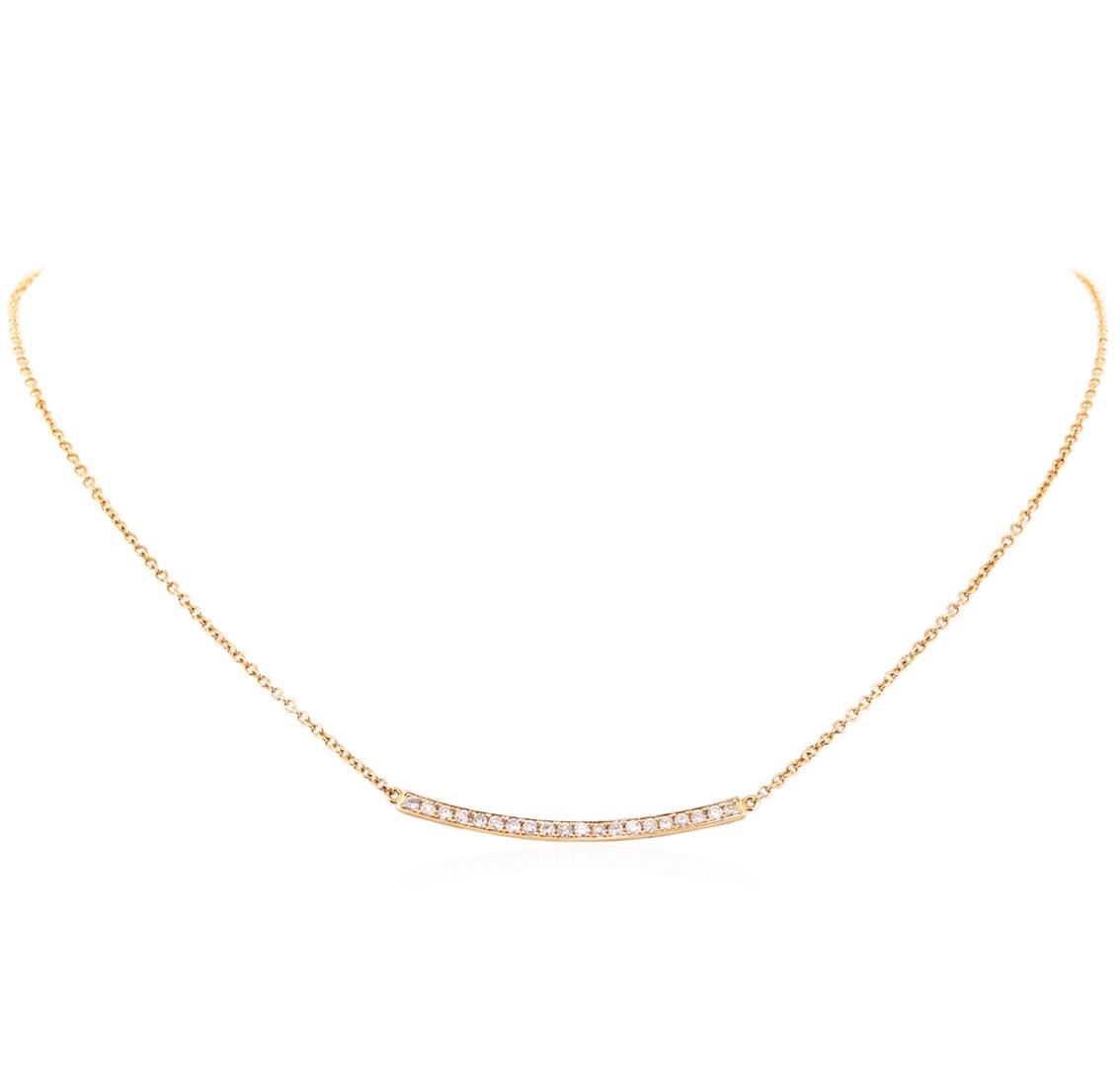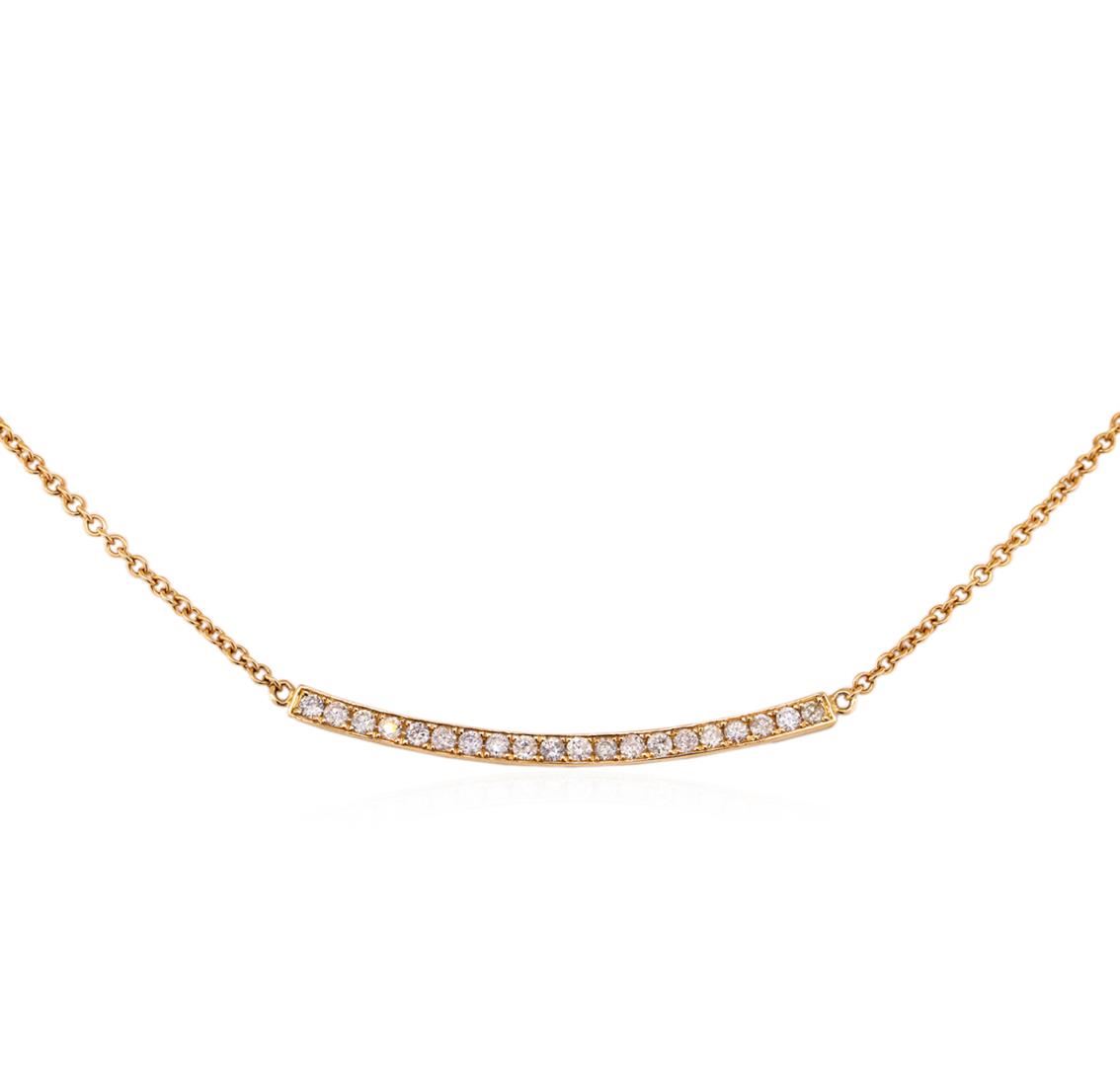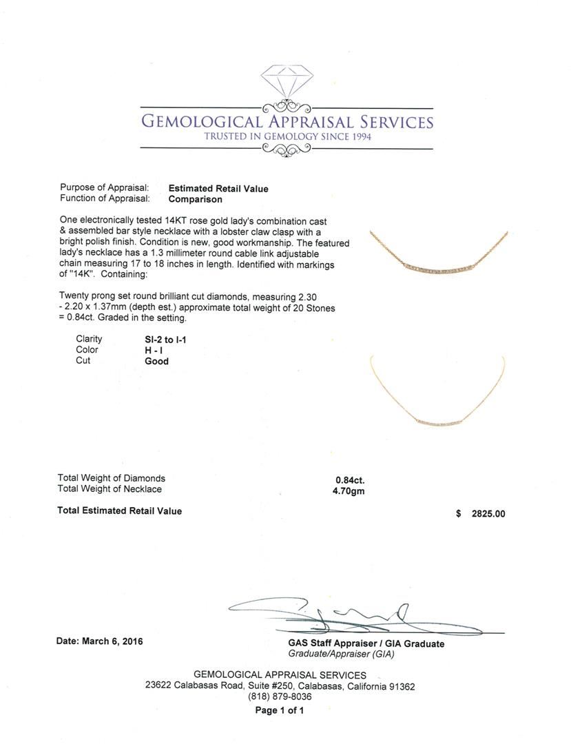 One electronically tested 14KT rose gold lady's combination cast & assembled bar style necklace with a lobster claw clasp with a bright polish finish. The featured lady's necklace has a 1.3 millimeter round cable link adjustable chain measuring 17 to 18 inches in length. Identified with markings of "14K". Condition is new, good workmanship. Containing: Twenty prong set round brilliant cut diamonds, measuring 2.30 - 2.20 x 1.37mm (depth est.) approximate. Total Weight of 20 Stones = 0.84ct. Graded in the setting. Clarity: SI-2 to I-1. Color: H - I, Cut Good. Total Weight of Diamonds 0.84ct. Total Weight of Necklace 4.70gm. GAS Appraised at $2,825.00.
