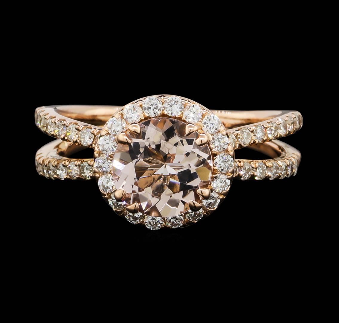 One Ladies ring featuring: 14KT rose gold weighing 2.80 grams containing one morganite weighing 1.00ct and diamonds weighing 0.75ctw.