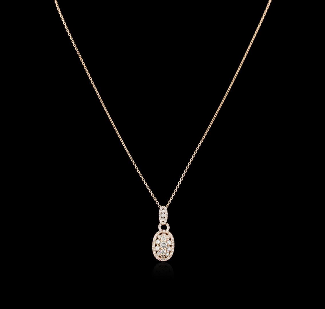 One electronically tested 14KT rose gold lady's combination cast & assembled fashion pendant & chain 16.0" long, 1mm diamond cut cable link with a lobster claw clasp with a bright polish finish. Identified with markings of "K14". Condition is new. Containing: One prong set round brilliant cut diamond, measuring 3.50 - 3.45 x 2.09mm (depth est.) approximate weight of 0.15ct. Graded in the setting. Clarity: I-1. Color: Good Six prong set round brilliant cut diamonds, measuring 2.80 - 2.70 x 1.65mm (depth est.) approximate total weight of 6 Stones = 0.46ct. Graded in the setting. Clarity: SI-2 to I-1. Color: H - I. Cut Good Nine prong set round brilliant cut diamonds, measuring 2.10 - 2.00 x 1.33mm (depth est.) approximate total weight of 9 Stones = 0.31ct. Graded in the setting. Clarity: SI-2 to I-1. Color: H - I. Cut Good Forty-Six prong set round brilliant cut diamonds, measuring 1.30 - 1.20 x 0.75mm (depth est.) approximate total weight of 46 Stones = 0.32ct. Graded in the setting. Clarity: SI-1 to I-1. Color: H - I. Cut Good. Total Weight of Diamonds 1.24ct. Total Weight of Pendant & Chain 4.90gm. GAS Appraised at $3,630.00.