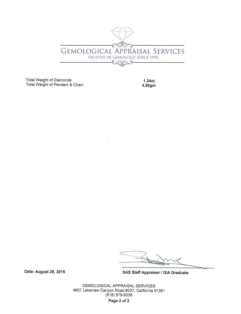 One electronically tested 14KT rose gold lady's combination cast & assembled fashion pendant & chain 16.0" long, 1mm diamond cut cable link with a lobster claw clasp with a bright polish finish. Identified with markings of "K14". Condition is new. Containing: One prong set round brilliant cut diamond, measuring 3.50 - 3.45 x 2.09mm (depth est.) approximate weight of 0.15ct. Graded in the setting. Clarity: I-1. Color: Good Six prong set round brilliant cut diamonds, measuring 2.80 - 2.70 x 1.65mm (depth est.) approximate total weight of 6 Stones = 0.46ct. Graded in the setting. Clarity: SI-2 to I-1. Color: H - I. Cut Good Nine prong set round brilliant cut diamonds, measuring 2.10 - 2.00 x 1.33mm (depth est.) approximate total weight of 9 Stones = 0.31ct. Graded in the setting. Clarity: SI-2 to I-1. Color: H - I. Cut Good Forty-Six prong set round brilliant cut diamonds, measuring 1.30 - 1.20 x 0.75mm (depth est.) approximate total weight of 46 Stones = 0.32ct. Graded in the setting. Clarity: SI-1 to I-1. Color: H - I. Cut Good. Total Weight of Diamonds 1.24ct. Total Weight of Pendant & Chain 4.90gm. GAS Appraised.