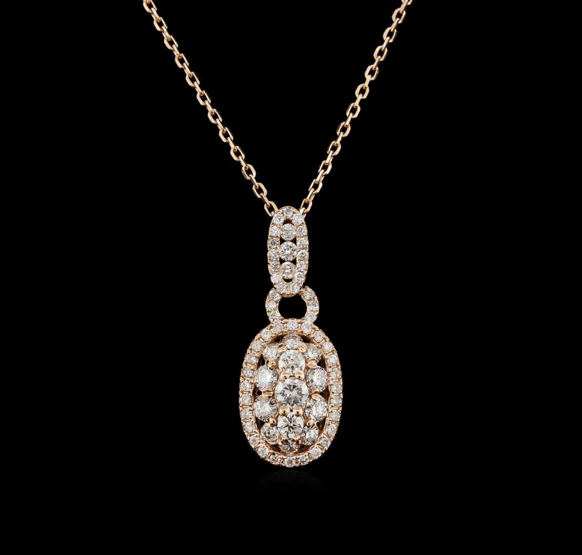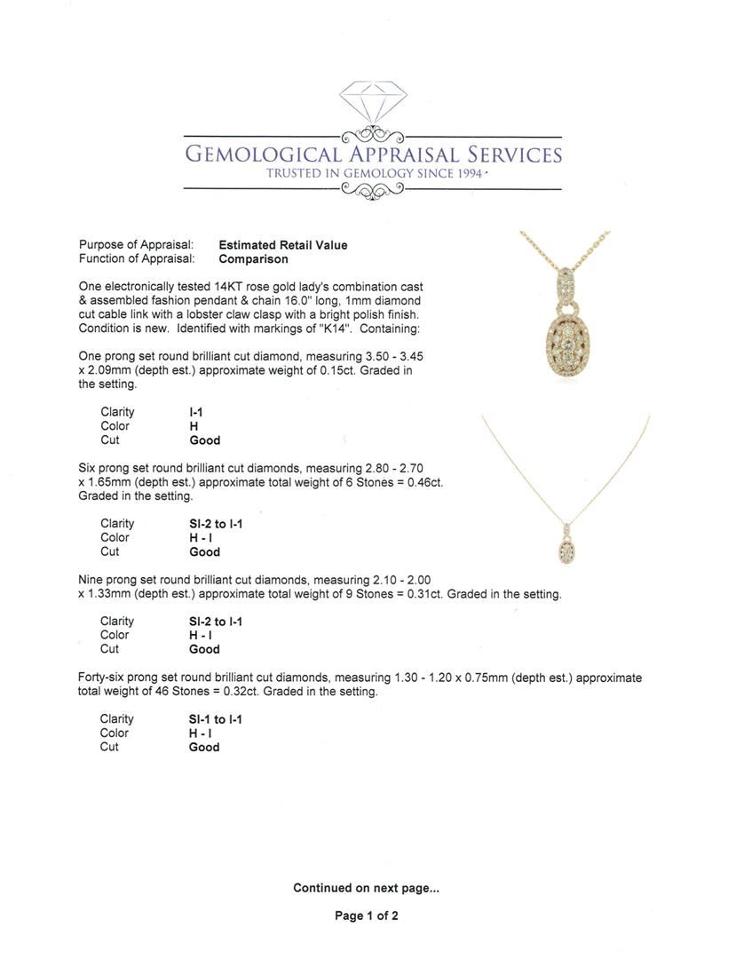 One electronically tested 14KT rose gold lady's combination cast & assembled fashion pendant & chain 16.0" long, 1mm diamond cut cable link with a lobster claw clasp with a bright polish finish. Identified with markings of "K14". Condition is new. Containing: One prong set round brilliant cut diamond, measuring 3.50 - 3.45 x 2.09mm (depth est.) approximate weight of 0.15ct. Graded in the setting. Clarity: I-1. Color: Good Six prong set round brilliant cut diamonds, measuring 2.80 - 2.70 x 1.65mm (depth est.) approximate total weight of 6 Stones = 0.46ct. Graded in the setting. Clarity: SI-2 to I-1. Color: H - I. Cut Good Nine prong set round brilliant cut diamonds, measuring 2.10 - 2.00 x 1.33mm (depth est.) approximate total weight of 9 Stones = 0.31ct. Graded in the setting. Clarity: SI-2 to I-1. Color: H - I. Cut Good Forty-Six prong set round brilliant cut diamonds, measuring 1.30 - 1.20 x 0.75mm (depth est.) approximate total weight of 46 Stones = 0.32ct. Graded in the setting. Clarity: SI-1 to I-1. Color: H - I. Cut Good. Total Weight of Diamonds 1.24ct. Total Weight of Pendant & Chain 4.90gm. GAS Appraised.