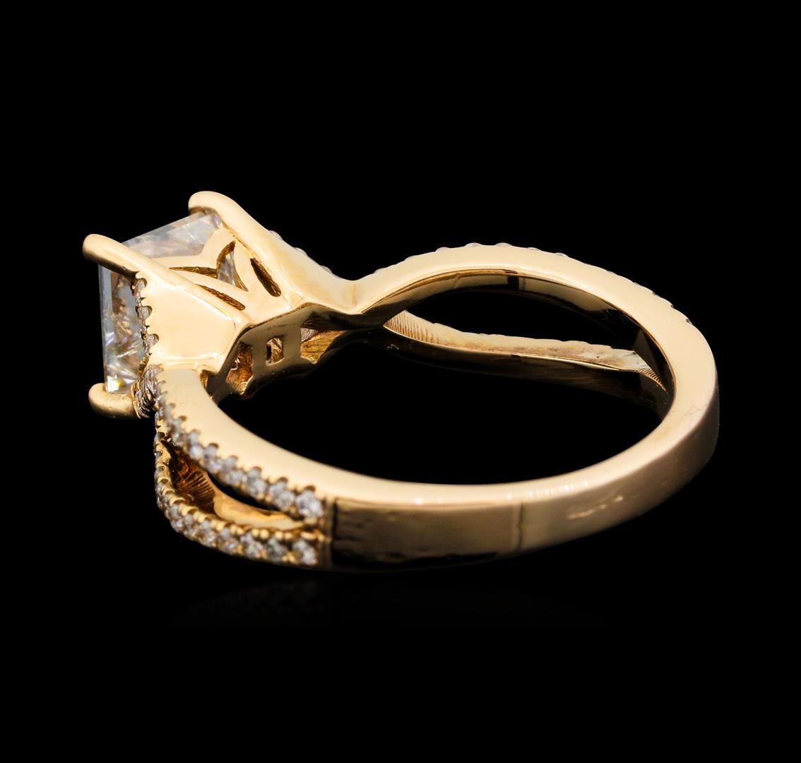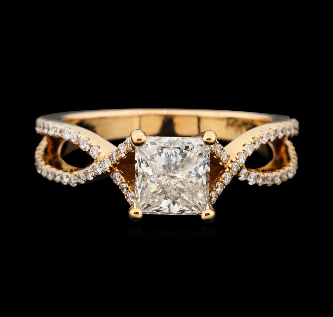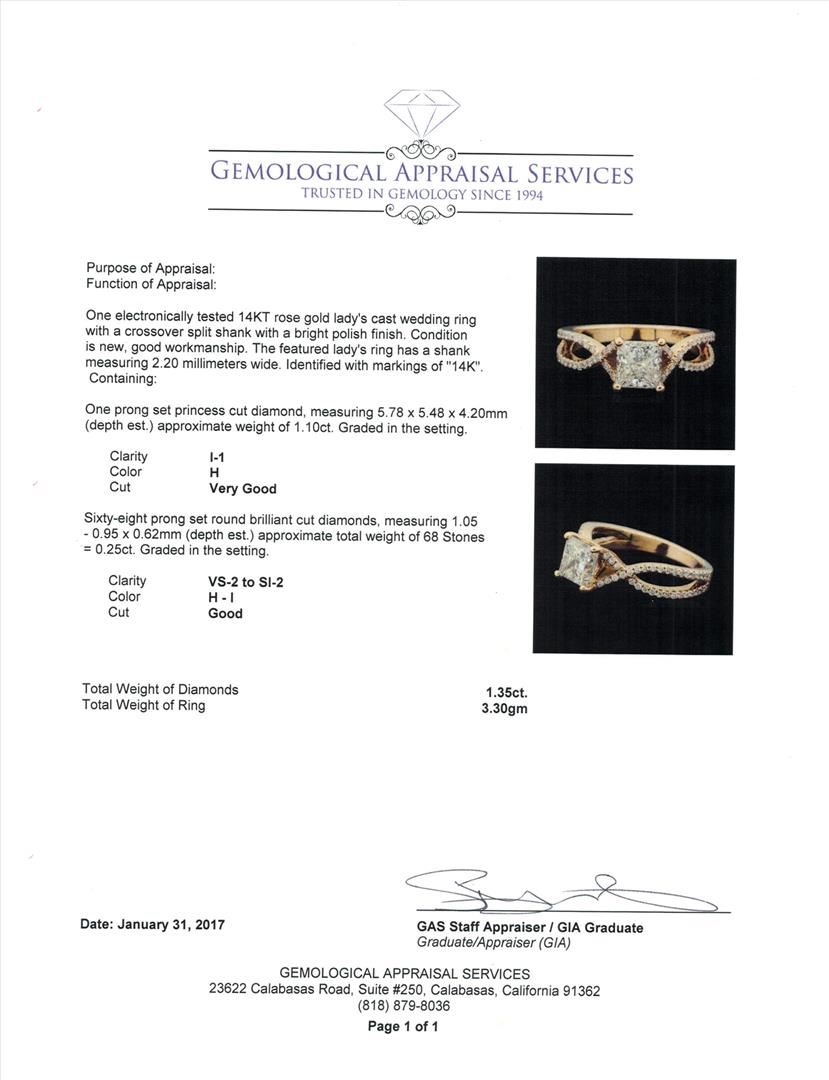 One electronically tested 14KT rose gold lady's cast wedding ring with a crossover split shank with a bright polish finish. The featured lady's ring has a shank measuring 2.20 millimeters wide. Identified with markings of "14K". Condition is new, good workmanship. Containing: One prong set princess cut diamond, measuring 5.78 x 5.48 x 4.20mm (depth est.) approximate weight of 1.10ct. Graded in the setting. Clarity: I-1. Color: HCut Very Good Sixty-Eight prong set round brilliant cut diamonds, measuring 1.05 - 0.95 x 0.62mm (depth est.) approximate total weight of 68 Stones = 0.25ct. Graded in the setting. Clarity: VS-2 to SI-2. Color: H - ICut Good. Total Weight of Diamonds 1.35ct. Total Weight of Ring 3.30gm. GAS Appraised.