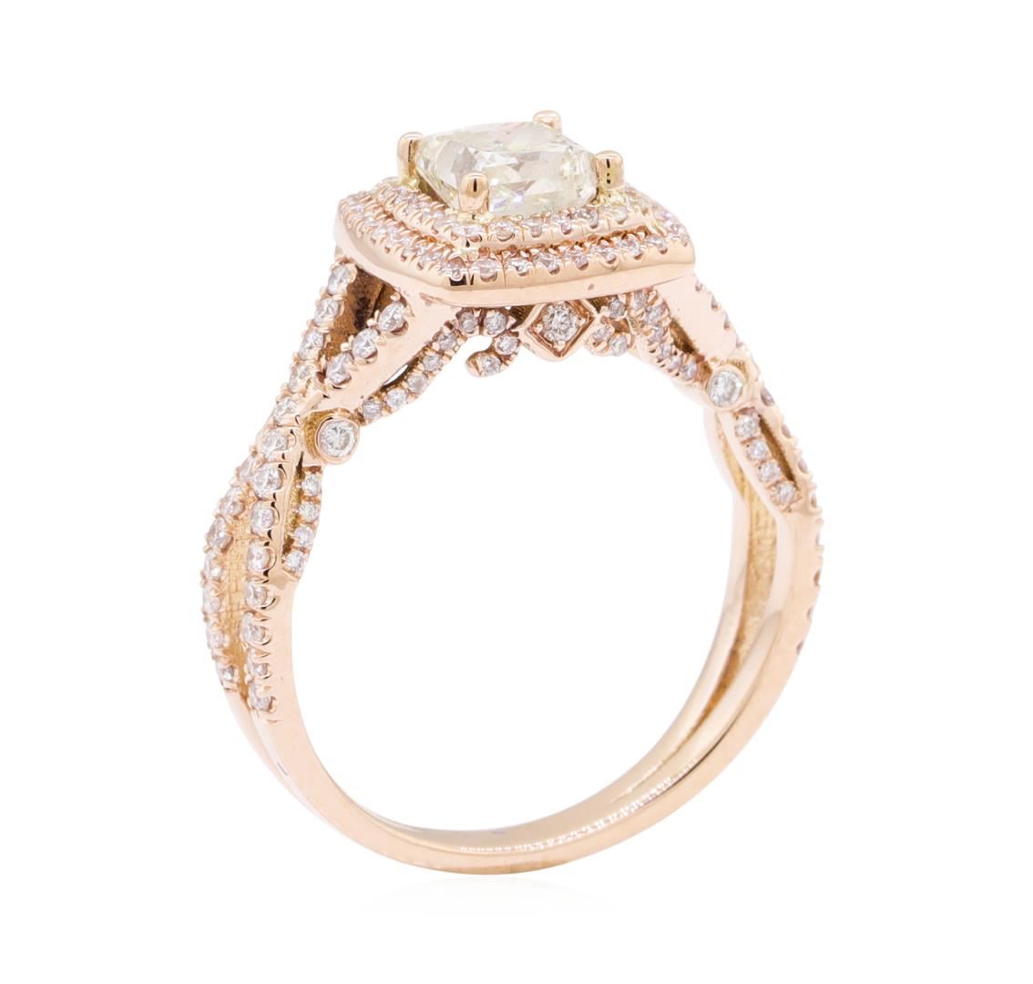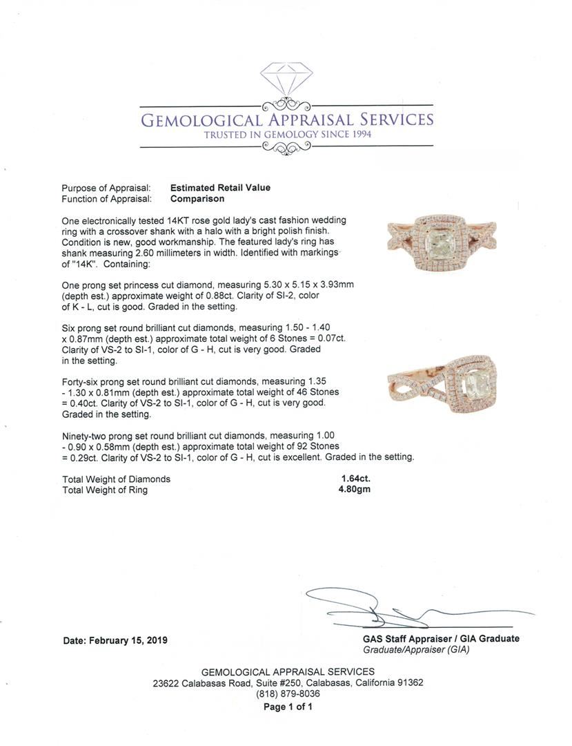 One electronically tested 14KT rose gold lady's cast fashion wedding ring with a crossover shank with a halo with a bright polish finish. The featured lady's ring has shank measuring 2.60 millimeters in width. Identified with markings of '14K'. Condition is new, good workmanship. Containing: One prong set princess cut diamond, measuring 5.30 x 5.15 x 3.93mm (depth est.) approximate weight of 0.88ct. Graded in the setting. Color K - L, Clarity SI-2 Cut Good Six prong set round brilliant cut diamonds, measuring 1.50 - 1.40 x 0.87mm (depth est.) approximate total weight of 6 Stones = 0.07ct. Graded in the setting. Color G - H, Clarity VS-2 to SI-1, Cut Very Good Forty-Six prong set round brilliant cut diamonds, measuring 1.35 - 1.30 x 0.81mm (depth est.) approximate total weight of 46 Stones = 0.40ct. Graded in the setting. Color G - H, Clarity VS-2 to SI-1, Cut Very Good Ninety-Two prong set round brilliant cut diamonds, measuring 1.00 - 0.90 x 0.58mm (depth est.) approximate total weight of 92 Stones = 0.29ct. Graded in the setting. Color G - H, Clarity VS-2 to SI-1 Cut Excellent. Total Weight of Diamonds 1.64ct. Total Weight of Ring 4.80gm. GAS Appraised.