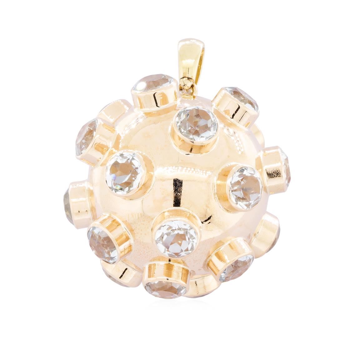 One ball pendant featuring: 14KT rose gold weighing 10.3 grams containing aquamarines weighing 10.00ctw.