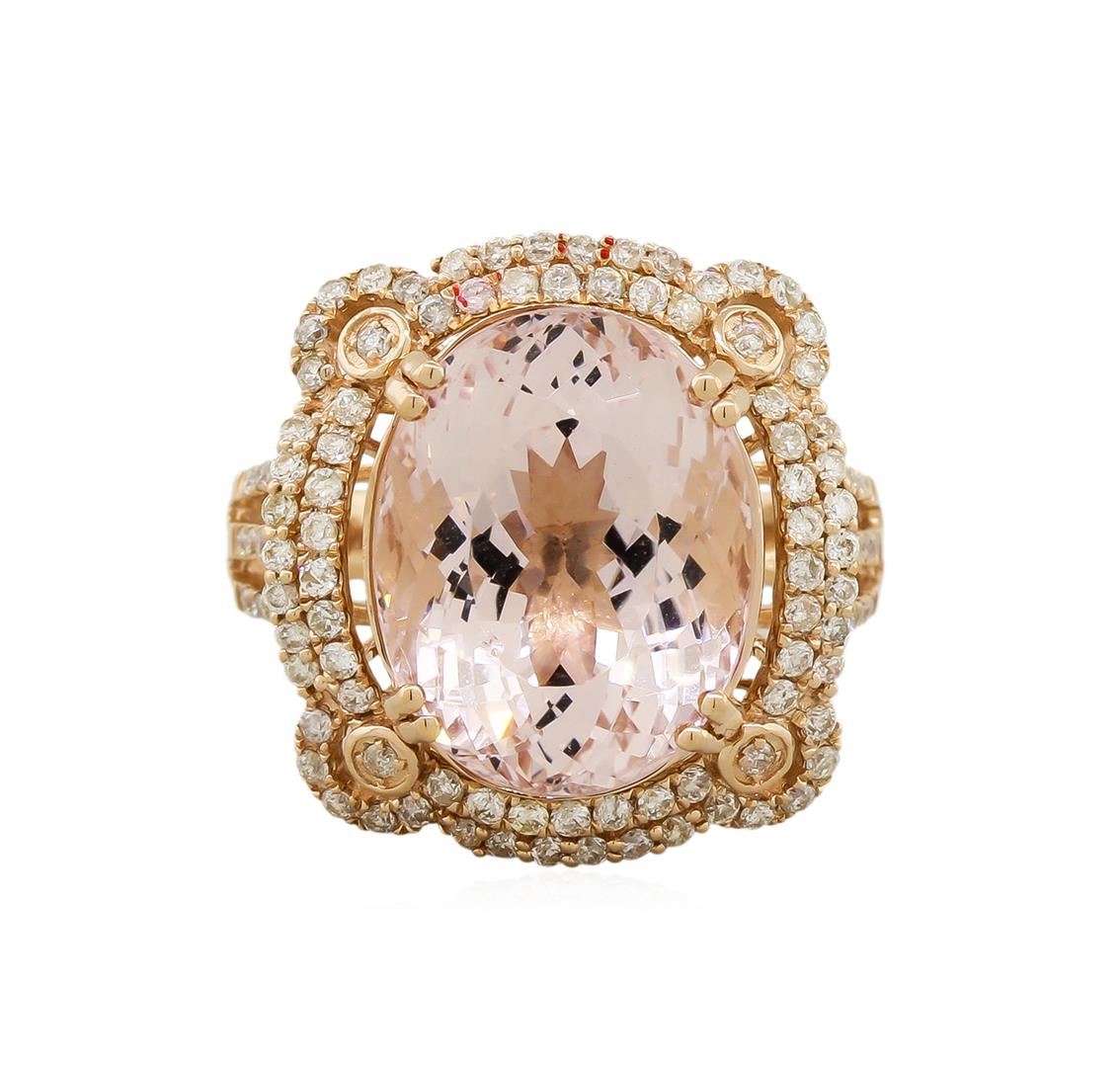 One electronically tested 14KT rose gold ladies cast morganite and diamond ring with a bright polish finish. The featured morganite is set within an inner basket and outer stylized diamond bezel supported by diamond set three-way split shoulders, completed by a two millimeter wide band. Trademark is Orianne. Identified with markings of "14K". Condition is new, good workmanship. Containing: One prong set oval mixed cut natural morganite, measuring 15.00 x 11.70 x 8.00mm, 15%. bulge factor, approximate weight of 10.49ct., clarity is eye clean, type I, light, slightly brownish, orangy red color, (GIA oR 3/2), cut is good. Transmitting light with no distortion, transparent. Graded in the setting.One Hundred Twenty-Eight prong set round brilliant cut diamonds approximate. Total Weight of 128 Stones = 0.89ct. Graded in the setting. Clarity: SI-2 to I-2. Color: F - H. Total Weight of Colored Stones 10.49ct. Total Weight of Diamonds 0.89ct. Total Weight of Ring 8.89gm. AIG Appraised at $10,900.00.