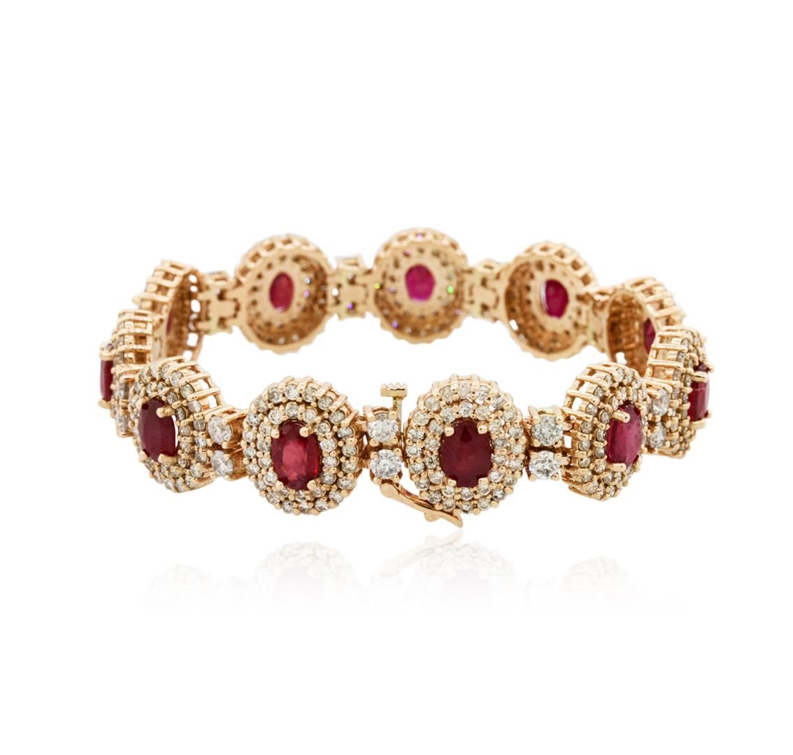 One electronically tested 14KT rose gold ladies cast & assembled ruby and diamond bracelet with a bright polish finish. Condition is new, good workmanship. Seven inch length bracelet features a ribbon of ruby and diamond bezels, alternated by diamond duos, terminating in a concealed clasp with safety clasp. Identified with markings of "14K". Containing: Eleven prong set oval mixed cut natural rubies, measuring 7.00 x 5.00 x 3.25mm, 6%. bulge factor, approximate. Total Weight of 10.89ct., clarity is heavily included, type II, medium dark, moderately strong, slightly purplish red color, (GIA slpR 6/4), cut is good. Transmitting light somewhat diffusely, transparent to translucent. Naturally occurring internal & external characteristics are present. Indications of laboratory high temperature heat treatment, with glass & flux additives. Measurements & the color grade are an average for the group. Graded in the setting. Ruby has a low tolerance to rhodium plating, repolishing the surface, & ultrasonic cleaning. Twenty-Two prong set round brilliant cut diamonds, measuring 3.20 - 3.10 x 1.89mm (depth est.) approximate. Total Weight of 22 Stones = 2.61ct. Graded in the setting. Clarity: I-1 to I-2. Color: H - J Three Hundred Seventy-Four prong set round brilliant cut diamonds, measuring 1.80 - 1.60 x 1.02mm (depth est.) approximate. Total Weight of 374 Stones = 6.79ct. Graded in the setting. Clarity: SI-2 to I-2. Color: K - M. Total Weight of Colored Stones 10.89ct. Total Weight of Diamonds 9.40ct. Total Weight of Bracelet 39.70 grams. AIG Appraised at $26,455.00.