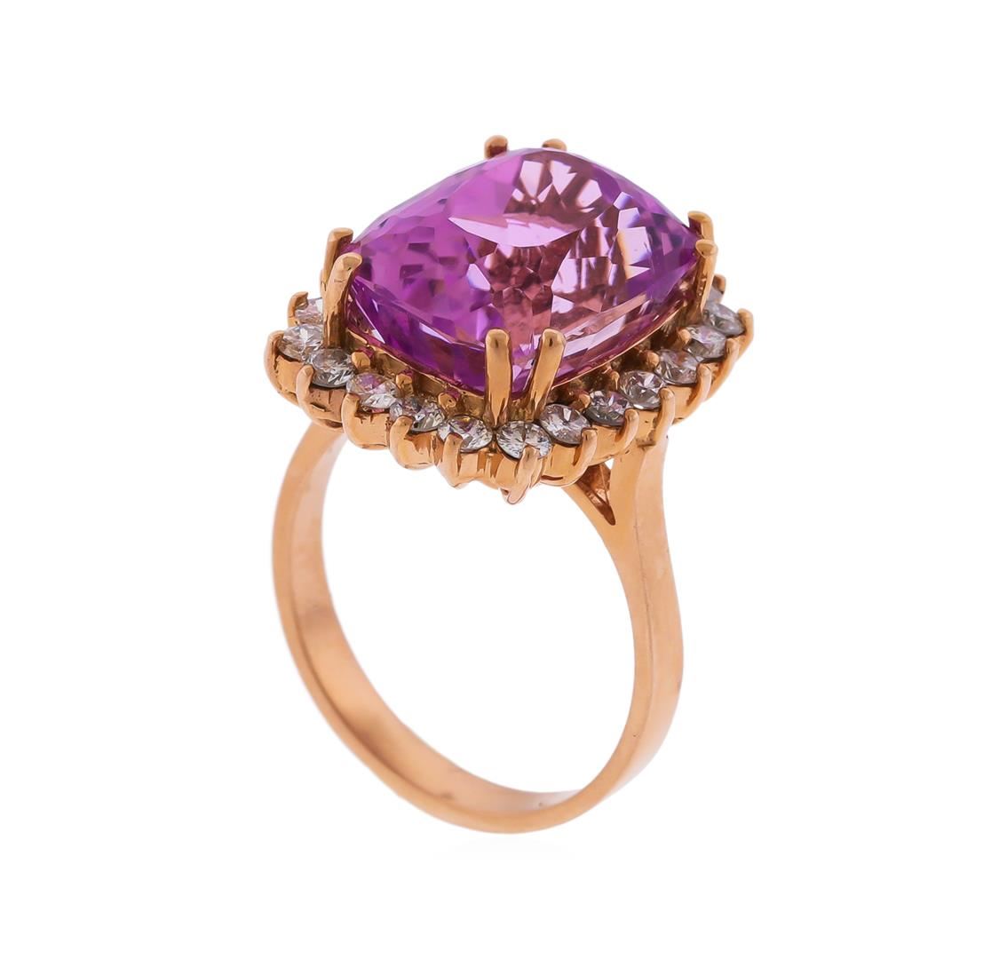 Containing 14KT Rose Gold Ring weighing approximately 7.50 grams. (1) Cushion Shaped Kunzite weighing approximately 11.42cts; Surrounded by diamonds weighing approximately 0.86ctw, Clarity: SI Clarity, Color: G-H. RBGS Appraised.