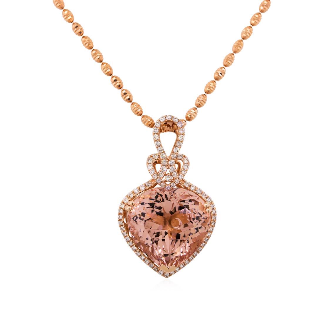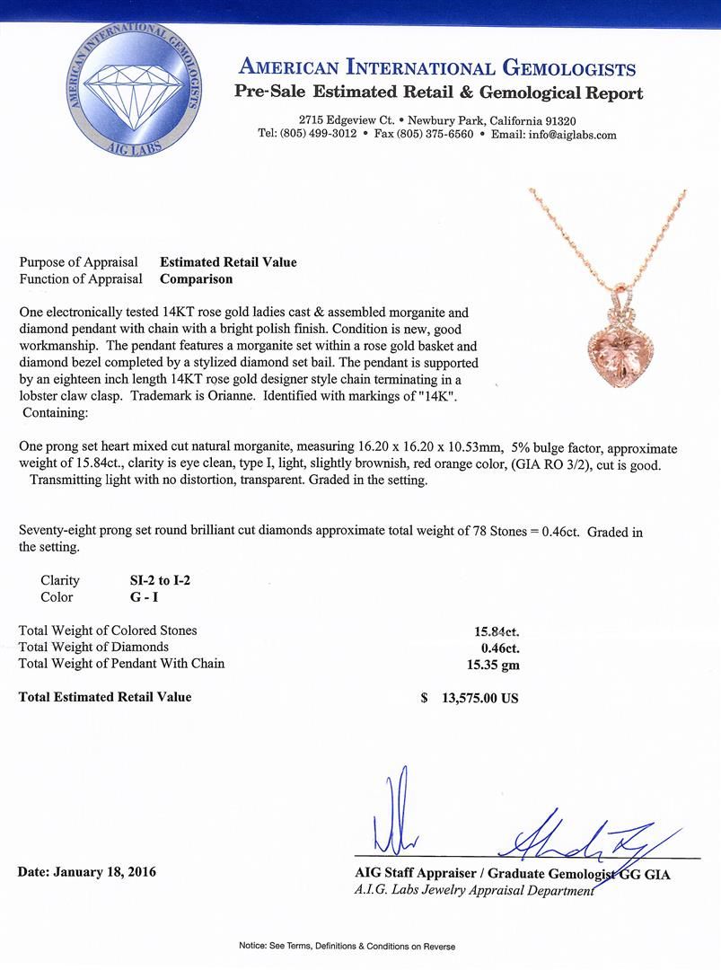 One electronically tested 14KT rose gold ladies cast & assembled morganite and diamond pendant with chain with a bright polish finish. The pendant features a morganite set within a rose gold basket and diamond bezel completed by a stylized diamond set bail. The pendant is supported by an eighteen inch length 14KT rose gold designer style chain terminating in a lobster claw clasp. Trademark is Orianne. Identified with markings of "14K". Condition is new, good workmanship. Containing: One prong set heart mixed cut natural morganite, measuring 16.20 x 16.20 x 10.53mm, 5%. bulge factor, approximate weight of 15.84ct., clarity is eye clean, type I, light, slightly brownish, red orange color, (GIA RO 3/2), cut is good. Transmitting light with no distortion, transparent. Graded in the setting.Seventy-Eight prong set round brilliant cut diamonds approximate. Total Weight of 78 Stones = 0.46ct. Graded in the setting. Clarity: SI-2 to I-2. Color: G - I. Total Weight of Colored Stones 15.84ct. Total Weight of Diamonds 0.46ct. Total Weight of Pendant With Chain 15.35gm. AIG Appraised at $13,575.00.