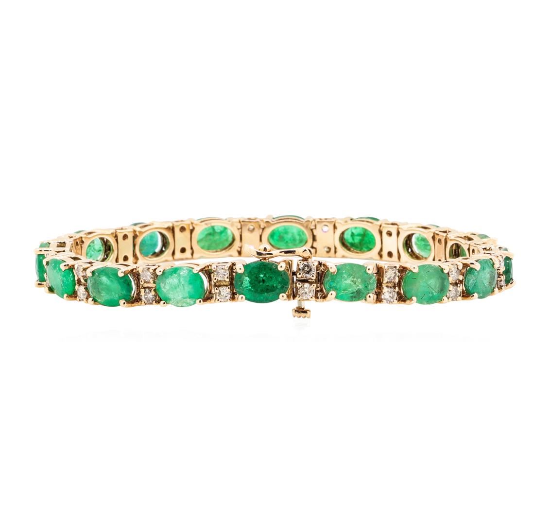 One electronically tested 14KT rose gold Ladies combination cast & assembled fashion bracelet with a tongue clasp with foldover safety with a bright polish finish. The featured Ladies bracelet measures approximately seven and a quarter inches in length. Identified with markings of '14K'. Condition is new, good workmanship. Containing: Sixteen prong set oval modified mixed cut natural emeralds, measuring 8.00 x 6.00 x 3.90mm, (depth est.) approximate total weight of 17.62ct., clarity is heavily included, medium, moderately strong, green color, (GIA G 5/4), cut is good. Transmitting light somewhat diffusely, semi-transparent to translucent. Naturally occurring internal & external characteristics are present. Indications of oil residue. Colored gemstones are presumed to have been subjected to commonly used enhancement processes. Graded in the setting. Thirty-Two prong set round brilliant cut diamonds, measuring 2.40 - 2.35 x 1.48mm (depth est.) approximate total weight of 32 Stones = 1.62ct. Graded in the setting. Color J - K Clarity SI-2 to I-1 Cut Good. Total Weight of Colored Stones 17.62ct.. Total Weight of Diamonds 1.62ct.. Total Weight of Bracelet 23.10gm. GAS Appraised.