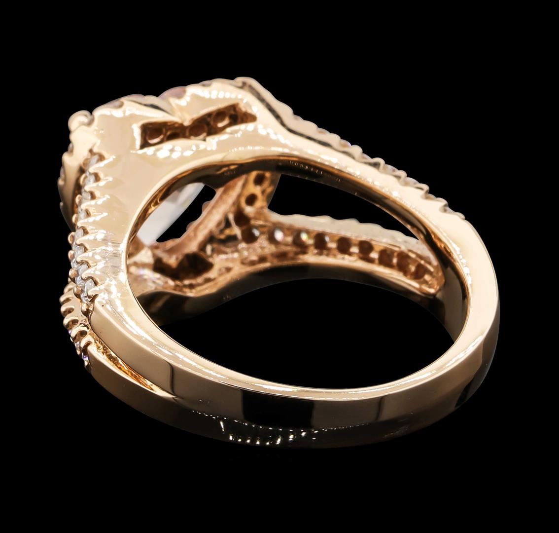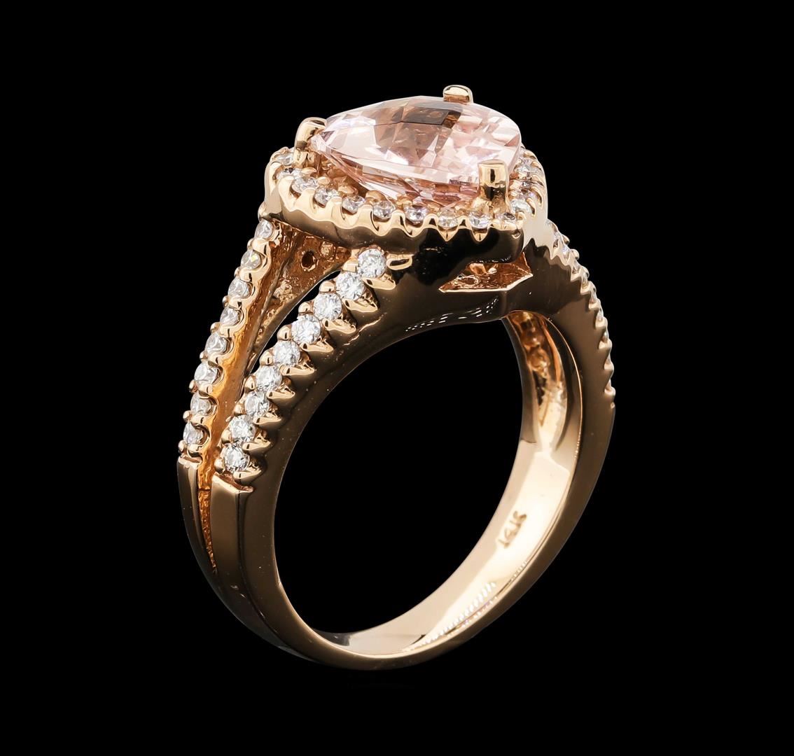 One electronically tested 14KT rose gold lady's cast fashion ring with a split shank heart shaped halo with a bright polish finish. The featured lady's ring has a shank measuring 3.34 millimeters wide. Identified with markings of "14K". Condition is new, good workmanship. Containing: One prong set heart modified brilliant cut natural morganite, measuring 9.10 x 8.98 x 4.84mm, (depth est.) approximate weight of 2.10ct., clarity is eye clean, light, moderately strong, reddish orange color, (GIA rO 3/4), cut is very good. The featured morganite is cut into a heart shape with a checkerboard top. Transmitting light with no distortion, transparent. Colored gemstones are presumed to have been subjected to commonly used enhancement processes. Graded in the setting. Fifty-Nine prong set round brilliant cut diamonds, measuring 1.40 - 1.35 x 0.86mm (depth est.) approximate total weight of 59 Stones = 0.59ct. Graded in the setting. Clarity: VS-2 to SI-1. Color: G - HCut Good. Total Weight of Colored Stones 2.10ct. Total Weight of Diamonds 0.59ct. Total Weight of Ring 7.90gm. GAS Appraised.