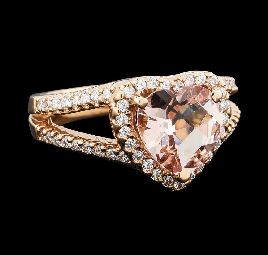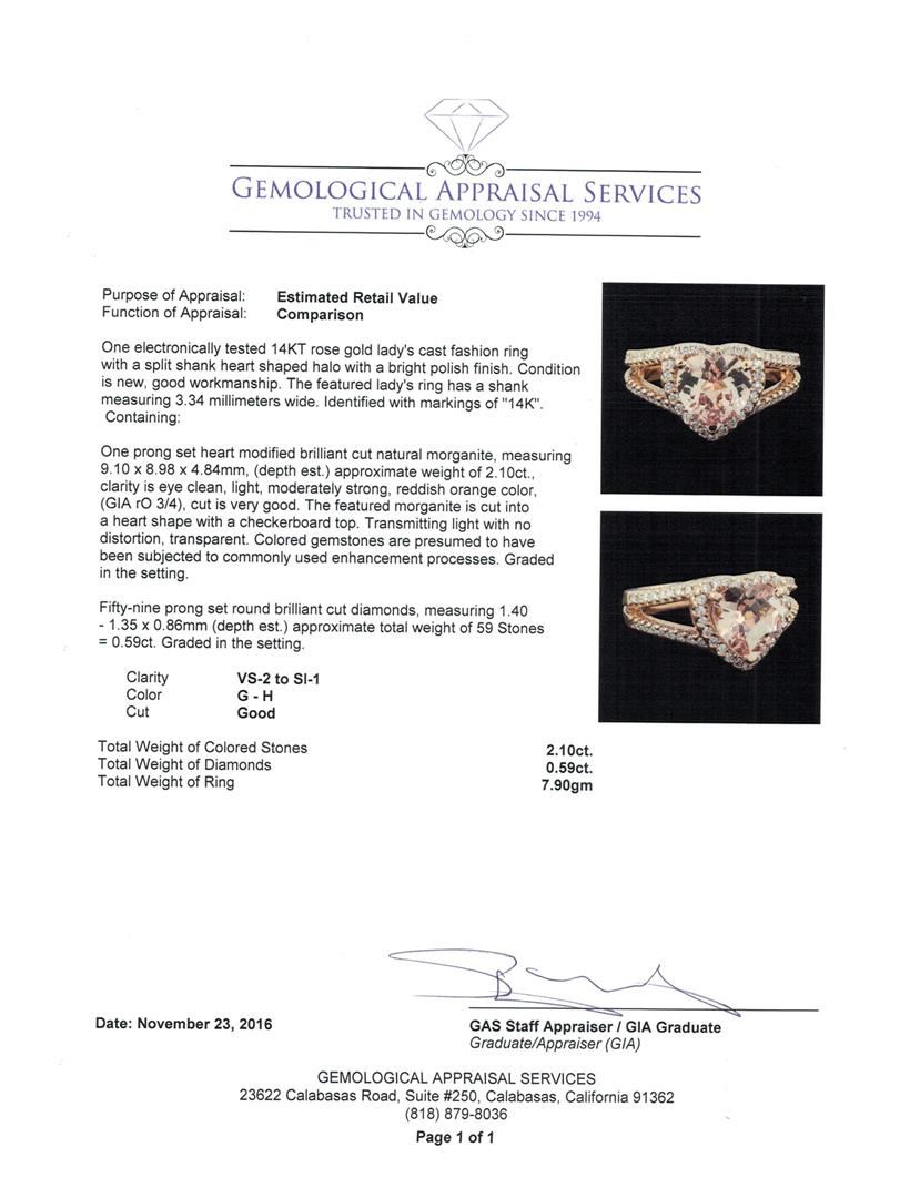 One electronically tested 14KT rose gold lady's cast fashion ring with a split shank heart shaped halo with a bright polish finish. The featured lady's ring has a shank measuring 3.34 millimeters wide. Identified with markings of "14K". Condition is new, good workmanship. Containing: One prong set heart modified brilliant cut natural morganite, measuring 9.10 x 8.98 x 4.84mm, (depth est.) approximate weight of 2.10ct., clarity is eye clean, light, moderately strong, reddish orange color, (GIA rO 3/4), cut is very good. The featured morganite is cut into a heart shape with a checkerboard top. Transmitting light with no distortion, transparent. Colored gemstones are presumed to have been subjected to commonly used enhancement processes. Graded in the setting. Fifty-Nine prong set round brilliant cut diamonds, measuring 1.40 - 1.35 x 0.86mm (depth est.) approximate total weight of 59 Stones = 0.59ct. Graded in the setting. Clarity: VS-2 to SI-1. Color: G - HCut Good. Total Weight of Colored Stones 2.10ct. Total Weight of Diamonds 0.59ct. Total Weight of Ring 7.90gm. GAS Appraised.