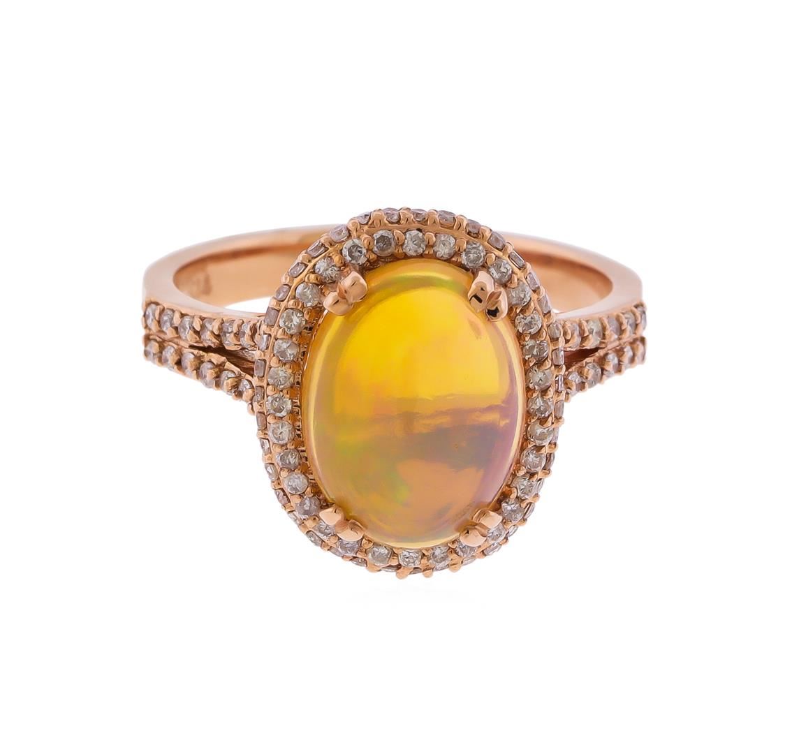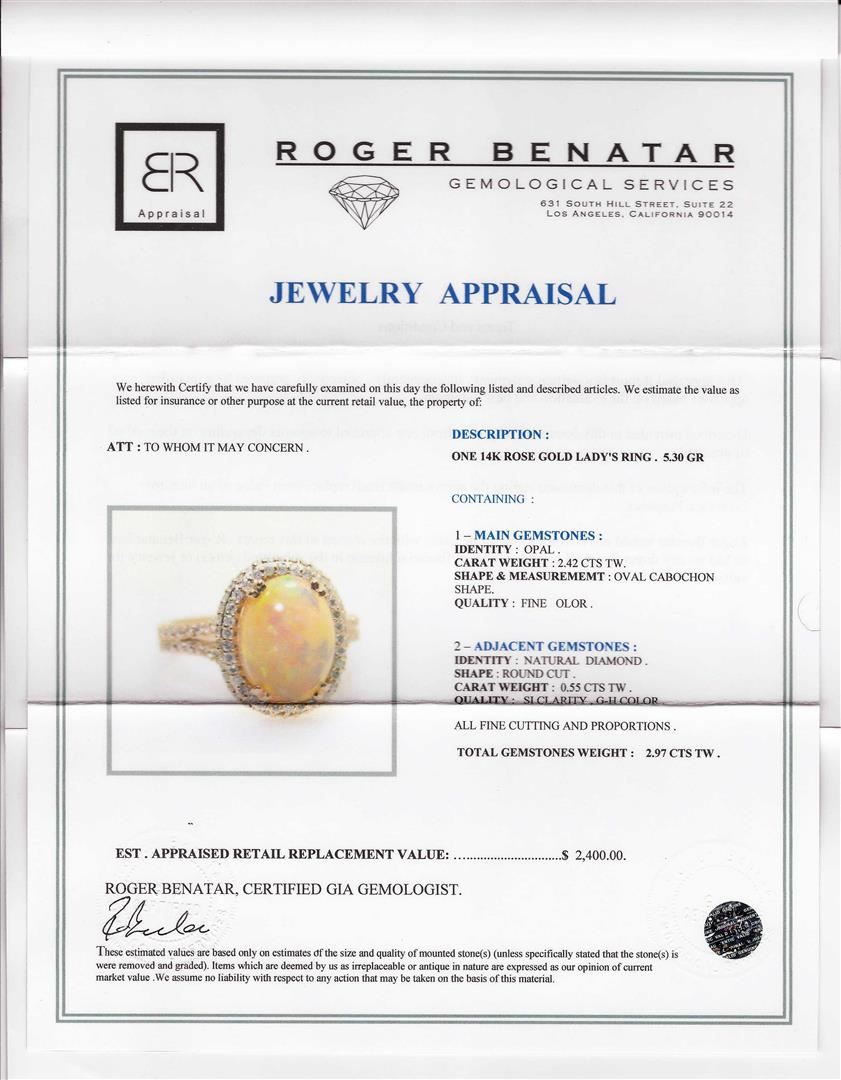 Containing 14KT Rose Gold Ring weighing approximately 5.30 grams. (1) Oval Shaped cabochon opal weighing approximately 2.42cts; Surrounded by diamonds weighing approximately 0.55ctw, Clarity: SI Clarity, Color: G-H. RBGS Appraised at $2,400.00.