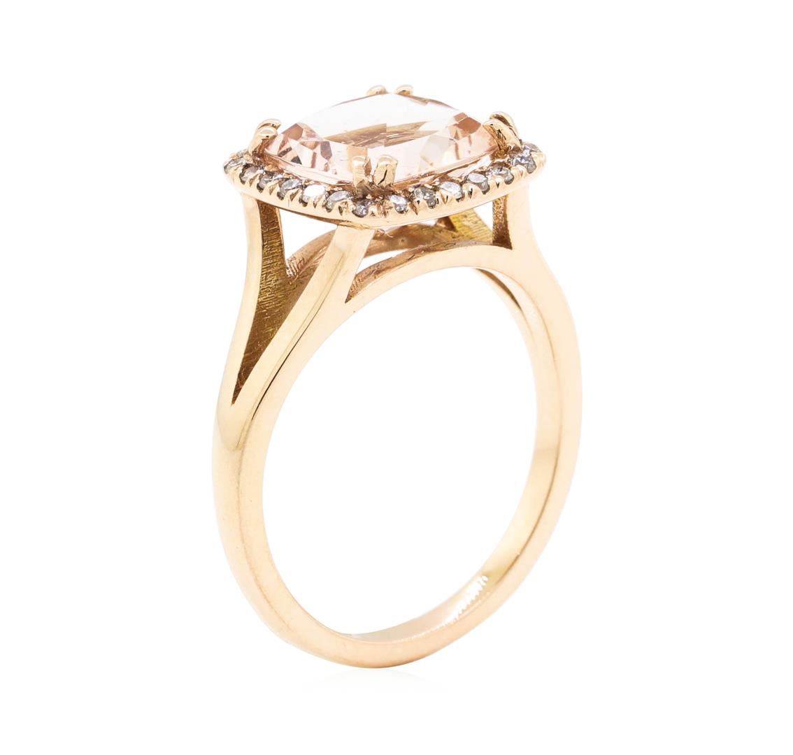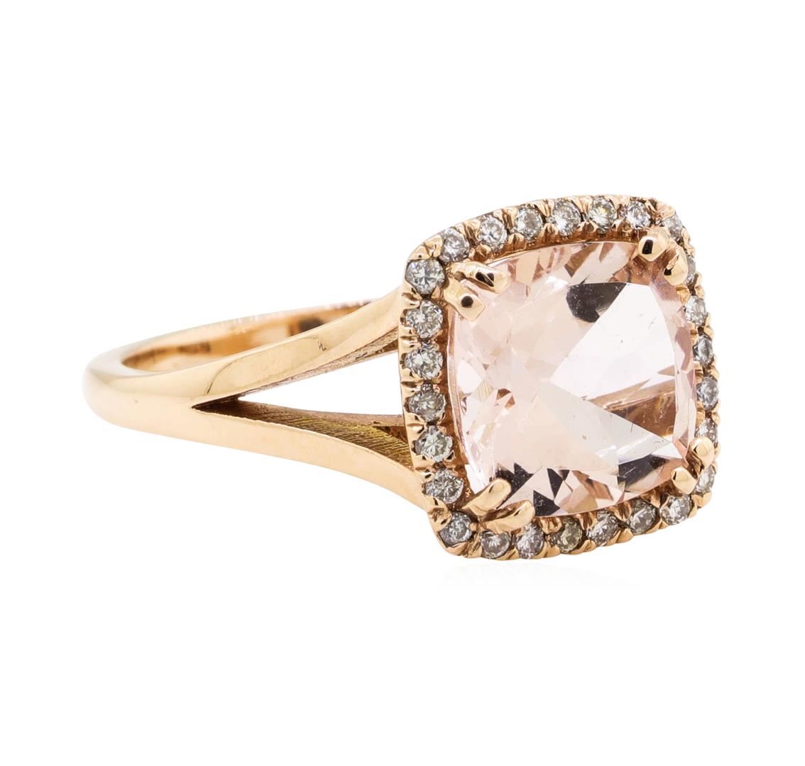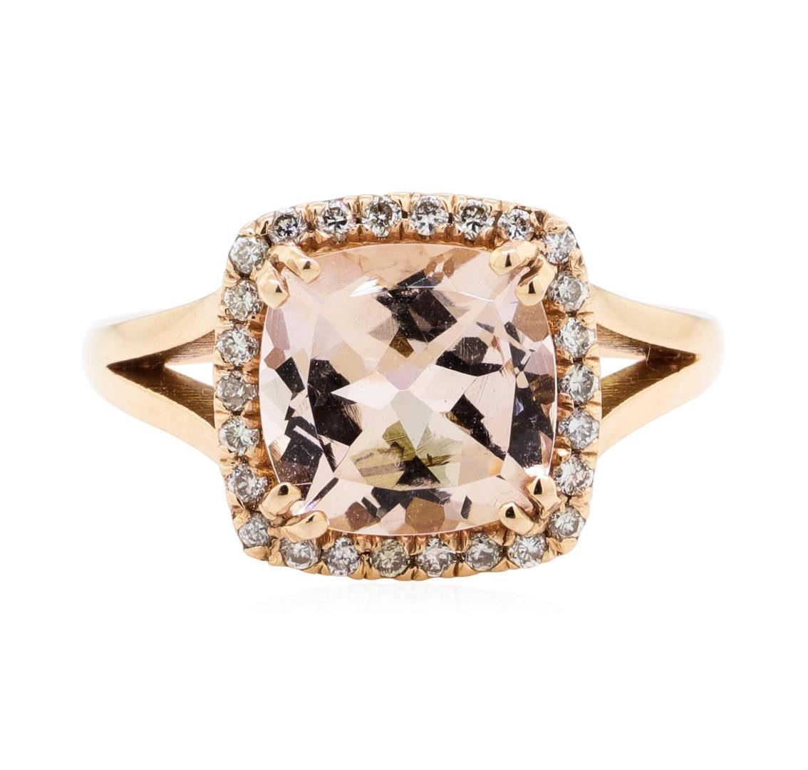 One Ladies ring featuring: 14KT rose gold weighing 3.9 grams containing one morganite center weighing 2.50ct and diamonds weighing 0.22ctw. The ring is a size 6.5.