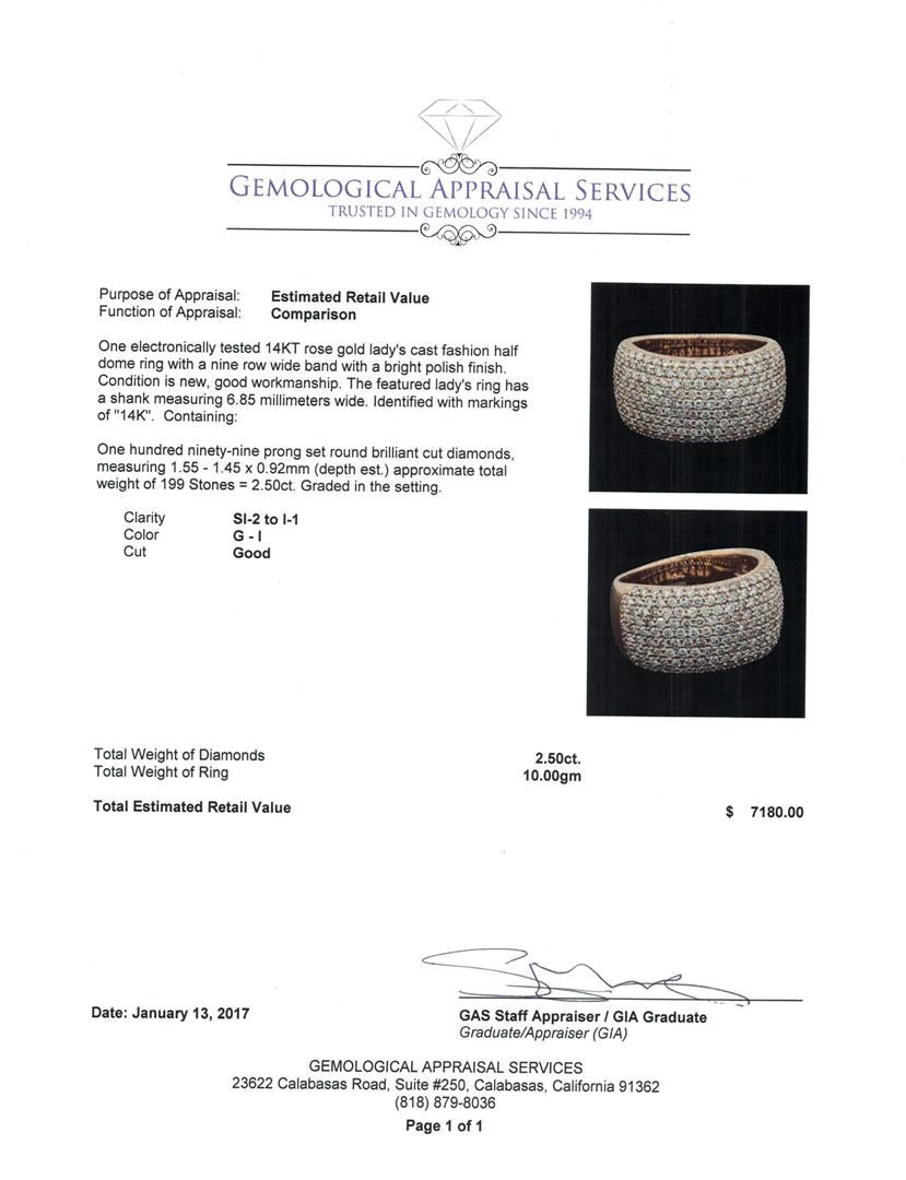 One electronically tested 14KT rose gold lady's cast fashion half dome ring with a nine row wide band with a bright polish finish. The featured lady's ring has a shank measuring 6.85 millimeters wide. Identified with markings of "14K". Condition is new, good workmanship. Containing: One Hundred Ninety-Nine prong set round brilliant cut diamonds, measuring 1.55 - 1.45 x 0.92mm (depth est.) approximate total weight of 199 Stones = 2.50ct. Graded in the setting. Clarity: SI-2 to I-1. Color: G - ICut Good. Total Weight of Diamonds 2.50ct. Total Weight of Ring 10.00gm. GAS Appraised at $7,180.00.