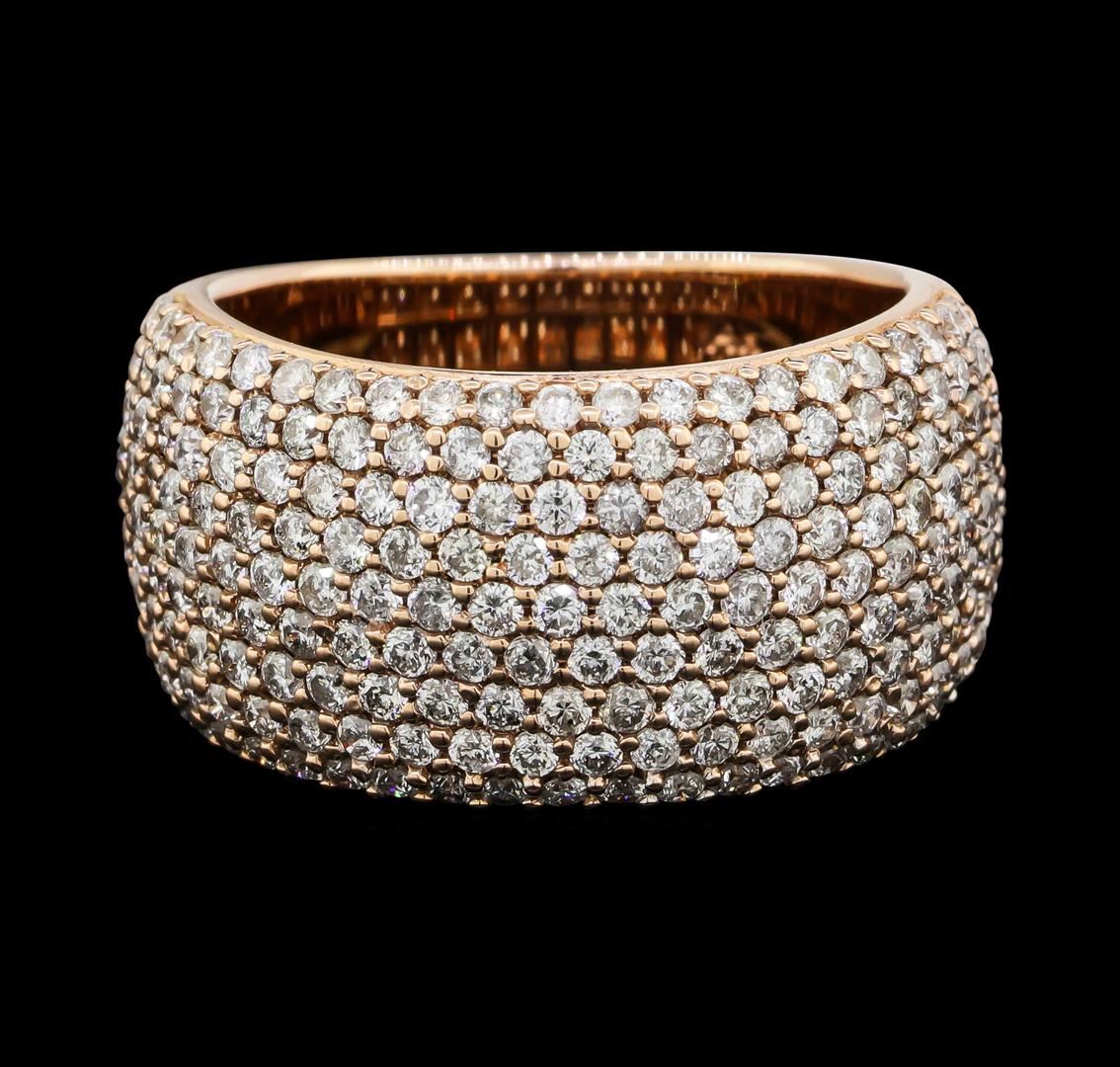 One electronically tested 14KT rose gold lady's cast fashion half dome ring with a nine row wide band with a bright polish finish. The featured lady's ring has a shank measuring 6.85 millimeters wide. Identified with markings of "14K". Condition is new, good workmanship. Containing: One Hundred Ninety-Nine prong set round brilliant cut diamonds, measuring 1.55 - 1.45 x 0.92mm (depth est.) approximate total weight of 199 Stones = 2.50ct. Graded in the setting. Clarity: SI-2 to I-1. Color: G - ICut Good. Total Weight of Diamonds 2.50ct. Total Weight of Ring 10.00gm. GAS Appraised at $7,180.00.