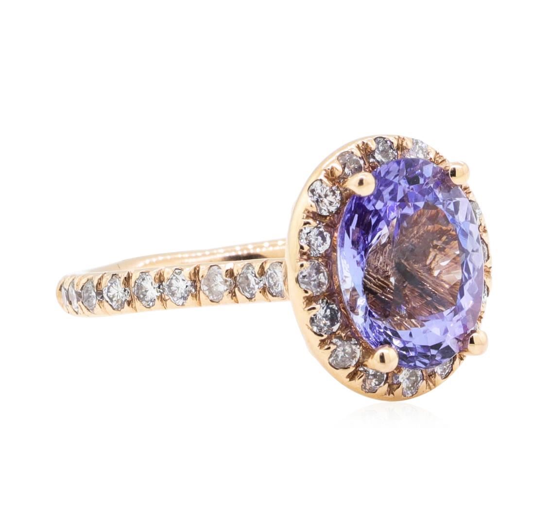 One electronically tested 14KT rose gold Ladies cast fashion ring with a cathedral shank oval halo with a bright polish finish. The featured Ladies ring has a shank measuring 2.45 millimeters in width. Identified with markings of '14K'. Condition is new, good workmanship. Containing: One prong set oval modified mixed cut natural tanzanite, measuring 11.08 x 9.00 x 5.50mm, (depth est.) approximate weight of 2.92ct., clarity is eye clean, medium light, moderately strong, bluish violet color, (GIA bV 4/4), cut is very good. Graded in the setting. Eighteen prong set round brilliant cut diamonds, measuring 2.00 - 1.90 x 1.21mm (depth est.) approximate total weight of 18 Stones = 0.50ct. Graded in the setting. Color H - I Clarity SI-1 to SI-2 Cut Good Sixteen prong set round brilliant cut diamonds, measuring 2.10 - 1.00 x 0.93mm (depth est.) approximate total weight of 16 Stones = 0.22ct. Graded in the setting. Color H - I Clarity SI-1 to SI-2 Cut Good. Total Weight of Colored Stones 2.92ct.. Total Weight of Diamonds 0.72ct.. Total Weight of Ring 5.70gm. GAS Appraised.