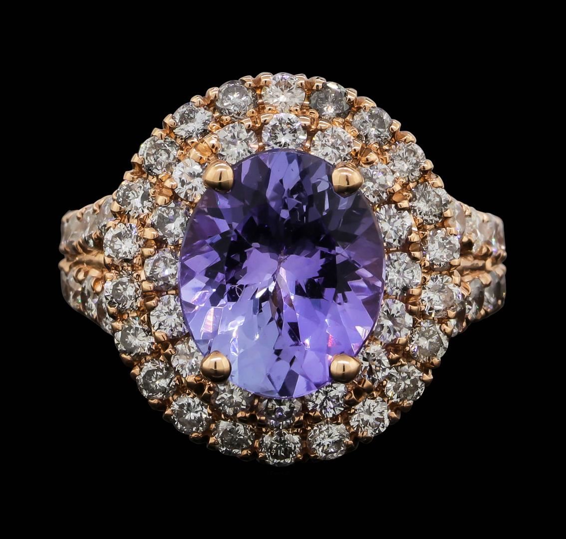 One electronically tested 14KT rose gold lady's cast fashion ring with a split shank double basket halo with a bright polish finish. The featured lady's ring has a double shank measuring 4.31 millimeters wide. Identified with markings of "14K". Condition is new, good workmanship. Containing: One prong set oval modified brilliant cut natural tanzanite, measuring 10.92 x 9.04 x 5.25mm, (depth est.) approximate weight of 3.20ct., clarity is eye clean, medium light, very slightly grayish, violet color, (GIA V 4/3), cut is very good. Transmitting light with no distortion, transparent. Colored gemstones are presumed to have been subjected to commonly used enhancement processes. Graded in the setting. Forty prong set round brilliant cut diamonds, measuring 2.10 - 2.00 x 1.27mm (depth est.) approximate total weight of 40 Stones = 1.30ct. Graded in the setting. Clarity: SI-2 to I-2. Color: I - JCut Good Thirty-Eight prong set round brilliant cut diamonds, measuring 1.60 - 1.55 x 0.98mm (depth est.) approximate total weight of 38 Stones = 0.56ct. Graded in the setting. Clarity: SI-2 to I-1. Color: H - ICut Good. Total Weight of Colored Stones 3.20ct. Total Weight of Diamonds 1.86ct. Total Weight of Ring 8.10gm. GAS Appraised.