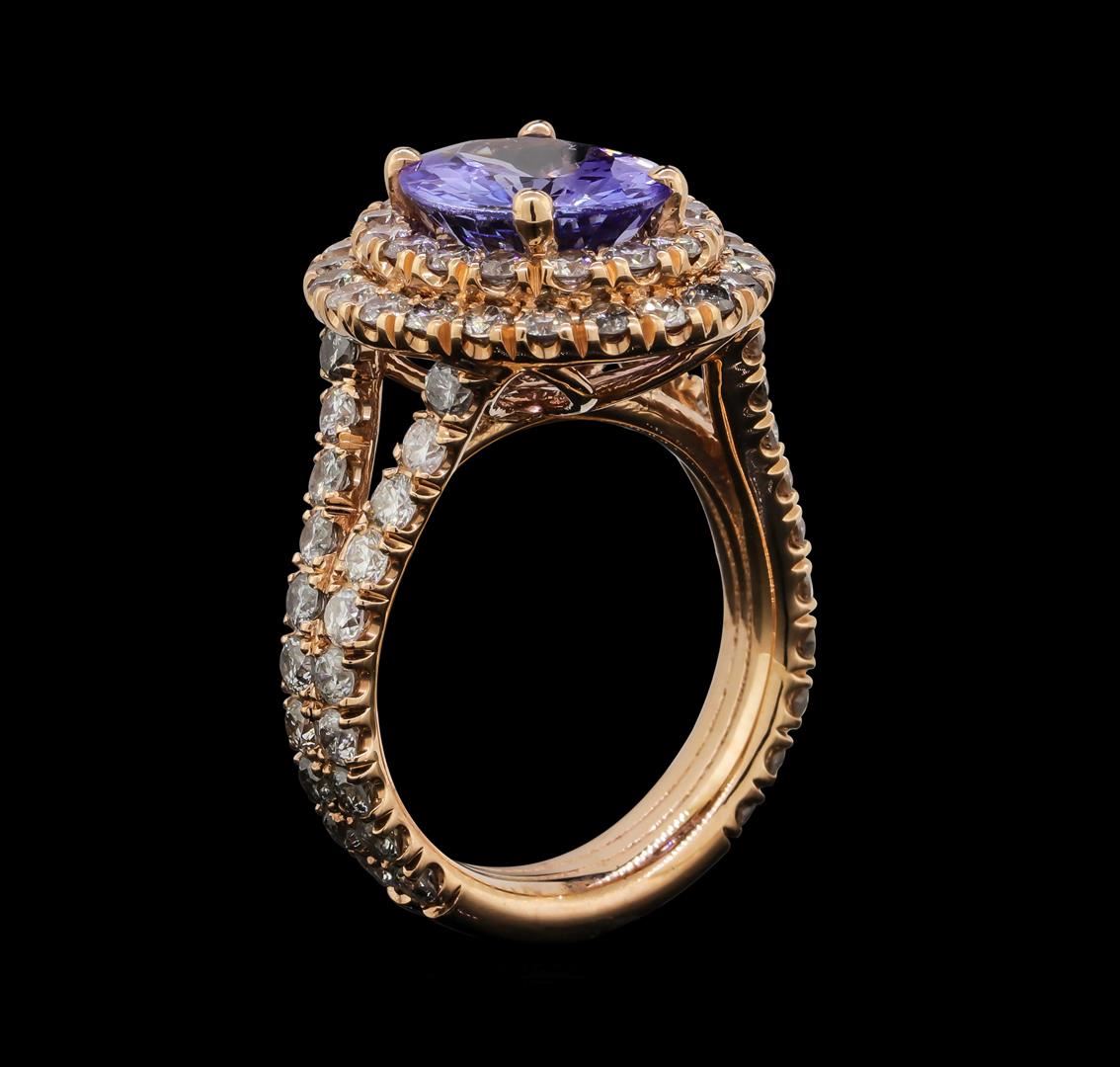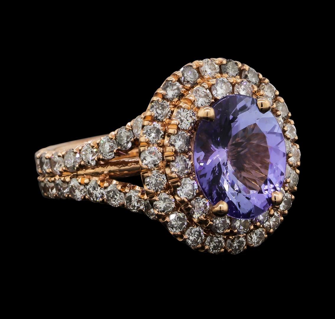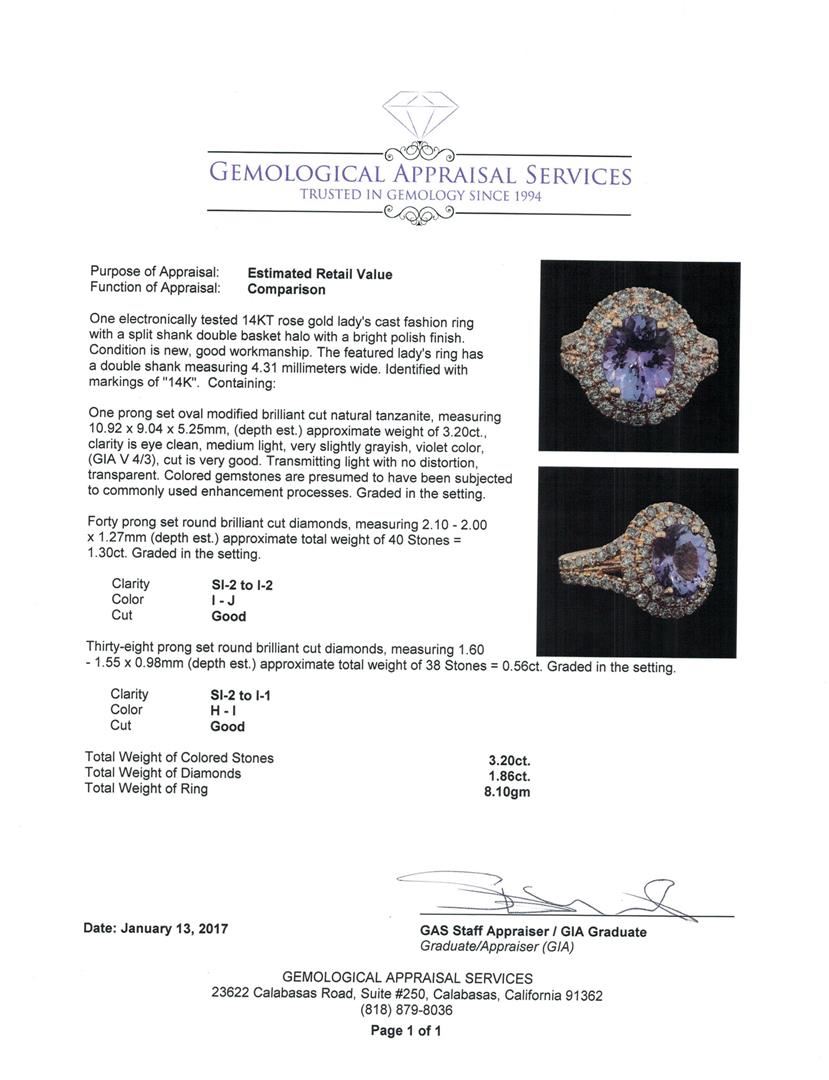 One electronically tested 14KT rose gold lady's cast fashion ring with a split shank double basket halo with a bright polish finish. The featured lady's ring has a double shank measuring 4.31 millimeters wide. Identified with markings of "14K". Condition is new, good workmanship. Containing: One prong set oval modified brilliant cut natural tanzanite, measuring 10.92 x 9.04 x 5.25mm, (depth est.) approximate weight of 3.20ct., clarity is eye clean, medium light, very slightly grayish, violet color, (GIA V 4/3), cut is very good. Transmitting light with no distortion, transparent. Colored gemstones are presumed to have been subjected to commonly used enhancement processes. Graded in the setting. Forty prong set round brilliant cut diamonds, measuring 2.10 - 2.00 x 1.27mm (depth est.) approximate total weight of 40 Stones = 1.30ct. Graded in the setting. Clarity: SI-2 to I-2. Color: I - JCut Good Thirty-Eight prong set round brilliant cut diamonds, measuring 1.60 - 1.55 x 0.98mm (depth est.) approximate total weight of 38 Stones = 0.56ct. Graded in the setting. Clarity: SI-2 to I-1. Color: H - ICut Good. Total Weight of Colored Stones 3.20ct. Total Weight of Diamonds 1.86ct. Total Weight of Ring 8.10gm. GAS Appraised.