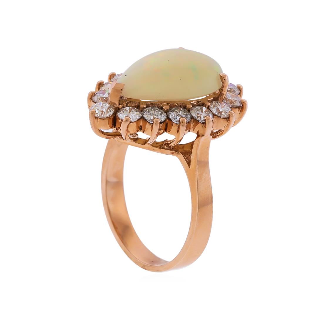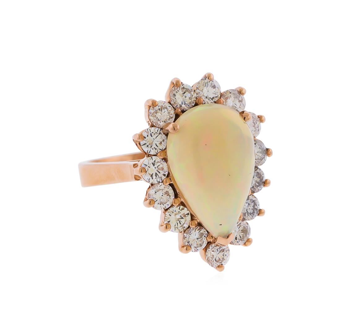 Containing 14KT Rose Gold Ring weighing approximately 6.50 grams. (1) Oval Shaped opal weighing approximately 3.31cts; Surrounded by diamonds weighing approximately 1.68ctw, Clarity: SI Clarity, Color: G-H. RBGS Appraised.