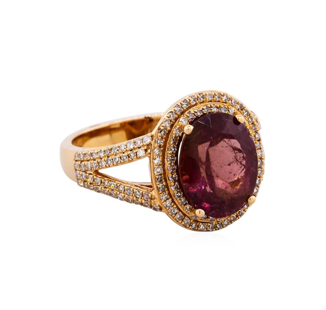 Elegant tourmaline and diamond ring set in 14KT rose gold weighing 5.85 grams containing an oval cut 3.61 carat tourmaline center stone showcased by one hundred and seventy-six round diamonds that extend down both sides of the band with a total weight of 0.82cts.