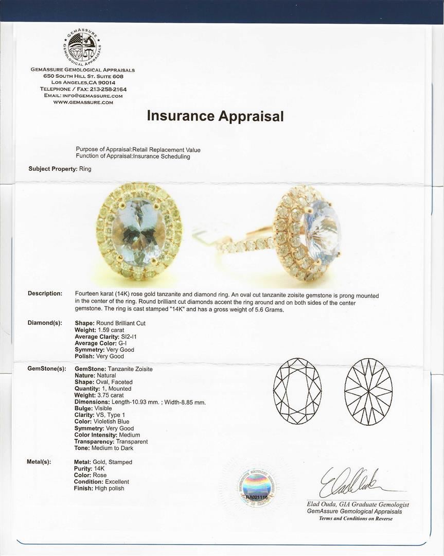 Fourteen karat ( 14K) rose gold tanzanite and diamond ring. An oval cut tanzanite zoisite gemstone, weighing approximately 3.75cts is prong mounted in the center of the ring. Round brilliant cut diamonds, weighing approximately 1.59ctw with an average color of SI-2 to I1 and an average color of G-I, accent the ring around And both sides of the center gemstone. The ring is Cast stamped "14K" and has a gross weight 5.6 Grams. GGA Appraised.