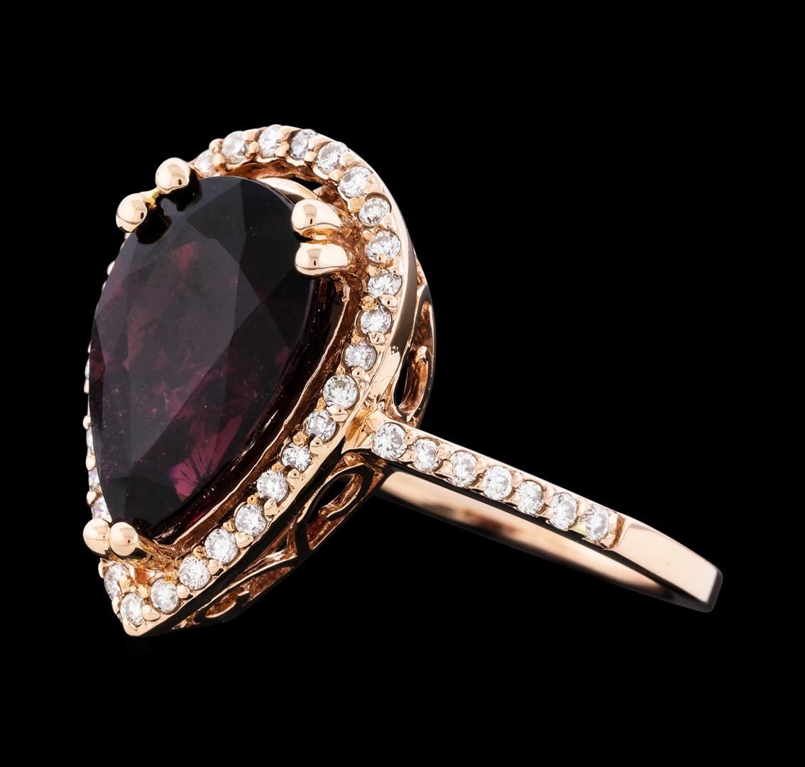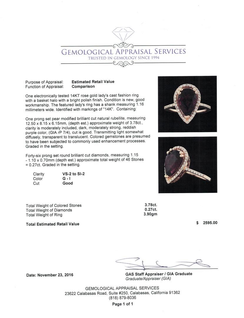 One electronically tested 14KT rose gold lady's cast fashion ring with a basket halo with a bright polish finish. The featured lady's ring has a shank measuring 1.16 millimeters wide. Identified with markings of "14K". Condition is new, good workmanship. Containing: One prong set pear modified brilliant cut natural rubellite, measuring 12.50 x 8.15 x 6.15mm, (depth est.) approximate weight of 3.78ct., clarity is moderately included, dark, moderately strong, reddish purple color, (GIA rP 7/4), cut is good. Transmitting light somewhat diffusely, transparent to translucent. Colored gemstones are presumed to have been subjected to commonly used enhancement processes. Graded in the setting. Forty-Six prong set round brilliant cut diamonds, measuring 1.15 - 1.10 x 0.70mm (depth est.) approximate total weight of 46 Stones = 0.27ct. Graded in the setting. Clarity: VS-2 to SI-2. Color: G - ICut Good. Total Weight of Colored Stones 3.78ct. Total Weight of Diamonds 0.27ct. Total Weight of Ring 3.90gm. GAS Appraised at $2,595.00.