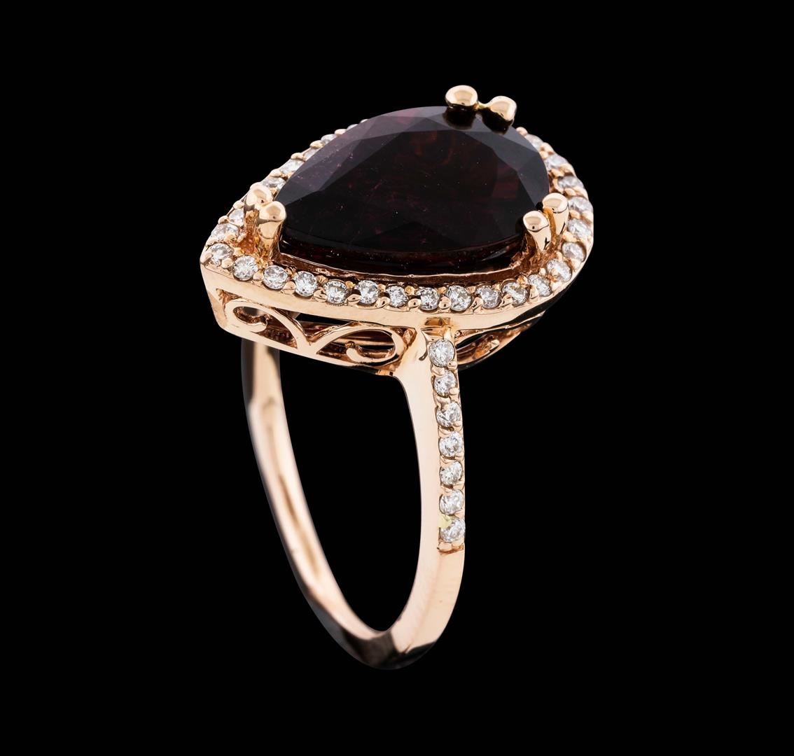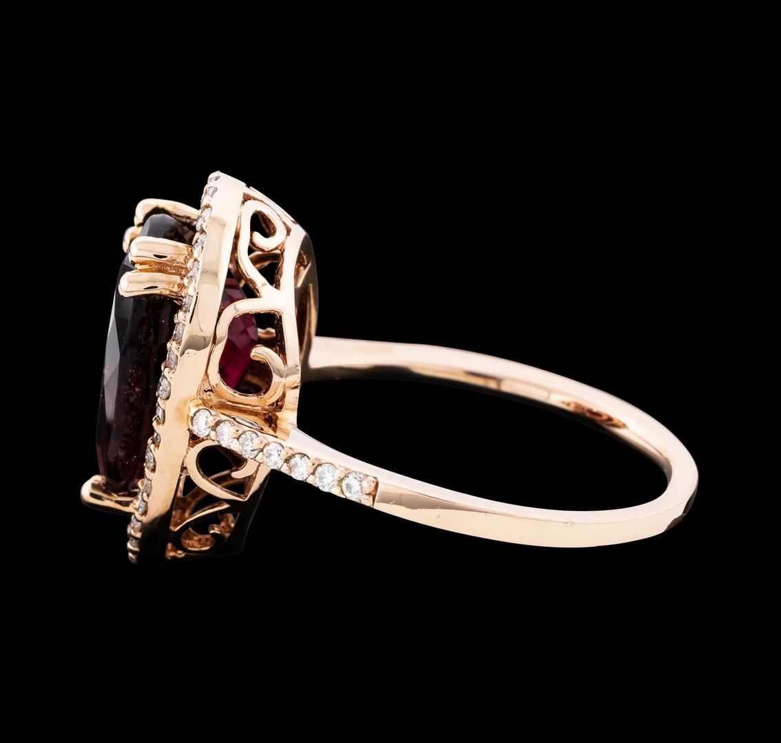 One electronically tested 14KT rose gold lady's cast fashion ring with a basket halo with a bright polish finish. The featured lady's ring has a shank measuring 1.16 millimeters wide. Identified with markings of "14K". Condition is new, good workmanship. Containing: One prong set pear modified brilliant cut natural rubellite, measuring 12.50 x 8.15 x 6.15mm, (depth est.) approximate weight of 3.78ct., clarity is moderately included, dark, moderately strong, reddish purple color, (GIA rP 7/4), cut is good. Transmitting light somewhat diffusely, transparent to translucent. Colored gemstones are presumed to have been subjected to commonly used enhancement processes. Graded in the setting. Forty-Six prong set round brilliant cut diamonds, measuring 1.15 - 1.10 x 0.70mm (depth est.) approximate total weight of 46 Stones = 0.27ct. Graded in the setting. Clarity: VS-2 to SI-2. Color: G - ICut Good. Total Weight of Colored Stones 3.78ct. Total Weight of Diamonds 0.27ct. Total Weight of Ring 3.90gm. GAS Appraised.