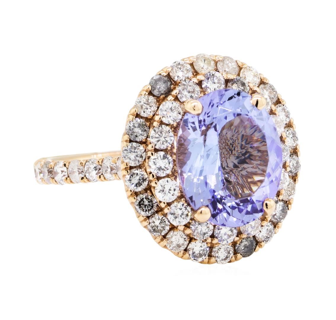 One electronically tested 14KT rose gold lady's cast fashion ring with a double basket halo with a bright polish finish. The featured lady's ring has a shank measuring 2.00 millimeters wide. Identified with markings of '14K'. Condition is new, good workmanship. Containing: One prong set oval modified brilliant cut natural tanzanite, measuring 11.08 x 9.02 x 5.40mm, (depth est.) approximate weight of 3.79ct., clarity is eye clean, light, very slightly grayish, violetish blue color, (GIA vB 3/3), cut is good. Transmitting light with no distortion, transparent. Colored gemstones are presumed to have been subjected to commonly used enhancement processes. Graded in the setting. Fifty-Six prong set round brilliant cut diamonds, measuring 2.00 - 1.95 x 1.23mm (depth est.) approximate total weight of 56 Stones = 1.70ct. Graded in the setting. Color H - K Clarity I-1 to I-2 Cut Good. Total Weight of Colored Stones 3.79ct.. Total Weight of Diamonds 1.70ct.. Total Weight of Ring 5.50gm. GAS Appraised.
