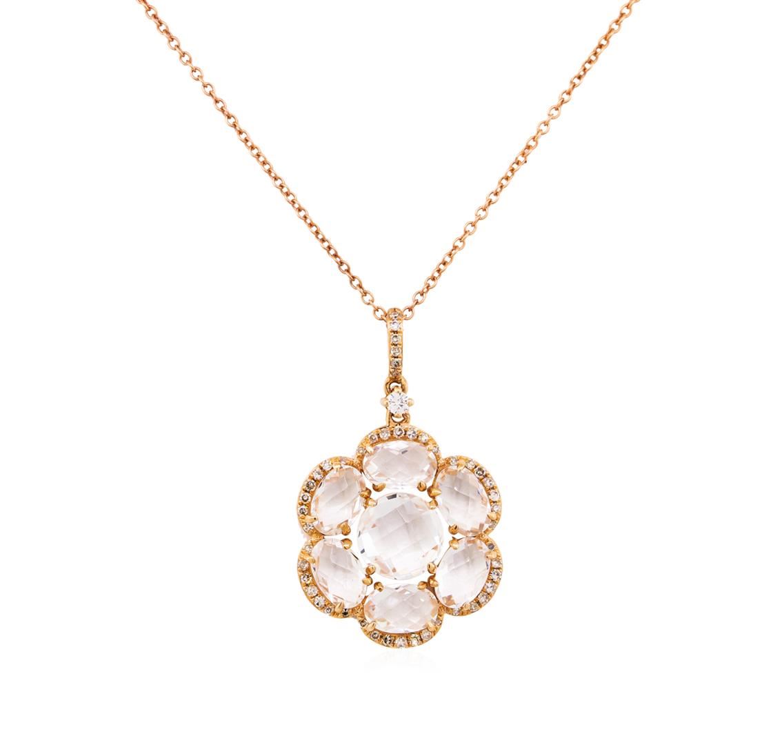 This pendant with chain is made of 14KT Rose Gold weighing approximately 3.20 grams. The pendant has seven prong set White Topaz gemstones weighing approximately 3.80ctw. There is approximately .20ctw of round cut diamonds. The 14KT Rose Gold chain has a length of 18".