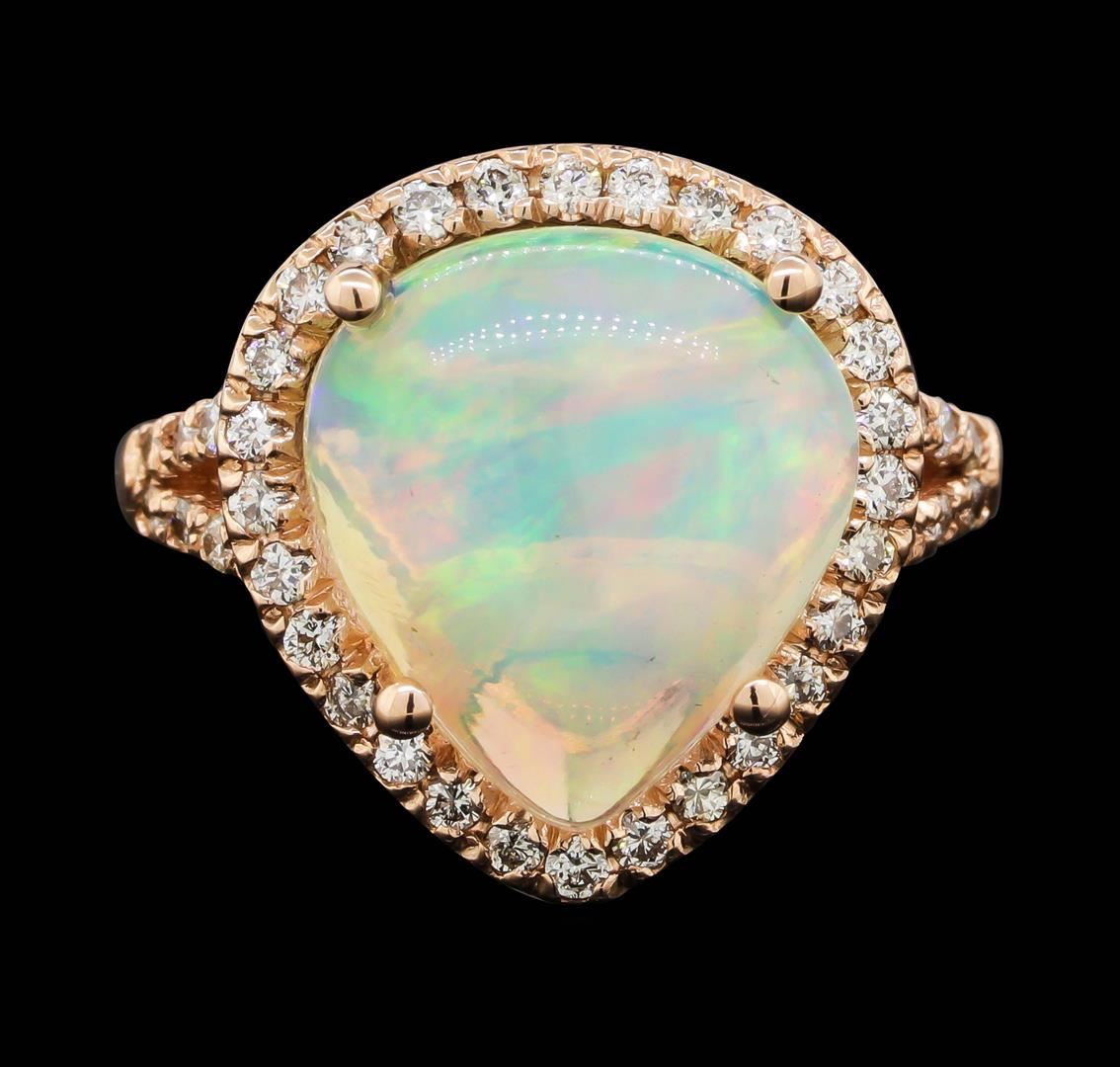 One electronically tested 14KT rose gold lady's cast fashion ring with a split cathedral shank with a halo with a bright polish finish. The featured lady's ring has a shank measuring 1.93 millimeters wide. Identified with markings of "14K". Condition is new, good workmanship. Containing: One crystal opal that is cut in a pear shaped cabochon and is prong set, measuring 13.01 mm long x 11.98 mm wide, and 4.68 mm thick and the approximate weight is 4.20 carats. The opal has a exceptionally bright, red-blue multicolor play of color (fire) in a rolling flashfire pattern; a medium dome; a good cut; no inclusions; consistent in its brightness and pattern; and is not directional. Graded in the setting. Fifty-Two prong set round brilliant cut diamonds, measuring 1.40 - 1.35 x 0.86mm (depth est.) approximate total weight of 52 Stones = 0.51ct. Graded in the setting. Clarity: SI-1 to SI-2. Color: H - ICut Very Good. Total Weight of Diamonds 0.51ct. Total Weight of Opals 4.20ct. Total Weight of Ring 4.20gm. GAS Appraised.