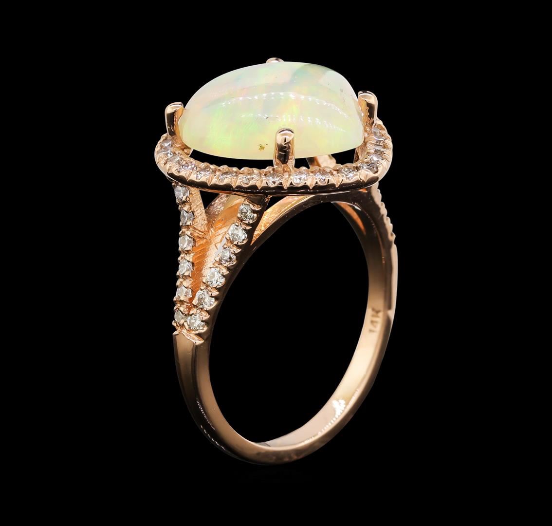 One electronically tested 14KT rose gold lady's cast fashion ring with a split cathedral shank with a halo with a bright polish finish. The featured lady's ring has a shank measuring 1.93 millimeters wide. Identified with markings of "14K". Condition is new, good workmanship. Containing: One crystal opal that is cut in a pear shaped cabochon and is prong set, measuring 13.01 mm long x 11.98 mm wide, and 4.68 mm thick and the approximate weight is 4.20 carats. The opal has a exceptionally bright, red-blue multicolor play of color (fire) in a rolling flashfire pattern; a medium dome; a good cut; no inclusions; consistent in its brightness and pattern; and is not directional. Graded in the setting. Fifty-Two prong set round brilliant cut diamonds, measuring 1.40 - 1.35 x 0.86mm (depth est.) approximate total weight of 52 Stones = 0.51ct. Graded in the setting. Clarity: SI-1 to SI-2. Color: H - ICut Very Good. Total Weight of Diamonds 0.51ct. Total Weight of Opals 4.20ct. Total Weight of Ring 4.20gm. GAS Appraised.