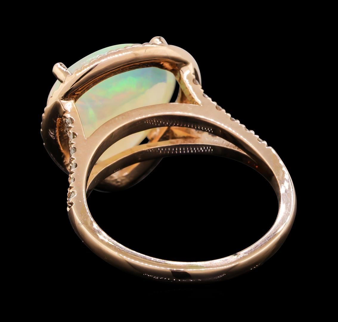 One electronically tested 14KT rose gold lady's cast fashion ring with a split cathedral shank with a halo with a bright polish finish. The featured lady's ring has a shank measuring 1.93 millimeters wide. Identified with markings of "14K". Condition is new, good workmanship. Containing: One crystal opal that is cut in a pear shaped cabochon and is prong set, measuring 13.01 mm long x 11.98 mm wide, and 4.68 mm thick and the approximate weight is 4.20 carats. The opal has a exceptionally bright, red-blue multicolor play of color (fire) in a rolling flashfire pattern; a medium dome; a good cut; no inclusions; consistent in its brightness and pattern; and is not directional. Graded in the setting. Fifty-Two prong set round brilliant cut diamonds, measuring 1.40 - 1.35 x 0.86mm (depth est.) approximate total weight of 52 Stones = 0.51ct. Graded in the setting. Clarity: SI-1 to SI-2. Color: H - ICut Very Good. Total Weight of Diamonds 0.51ct. Total Weight of Opals 4.20ct. Total Weight of Ring 4.20gm. GAS Appraised.