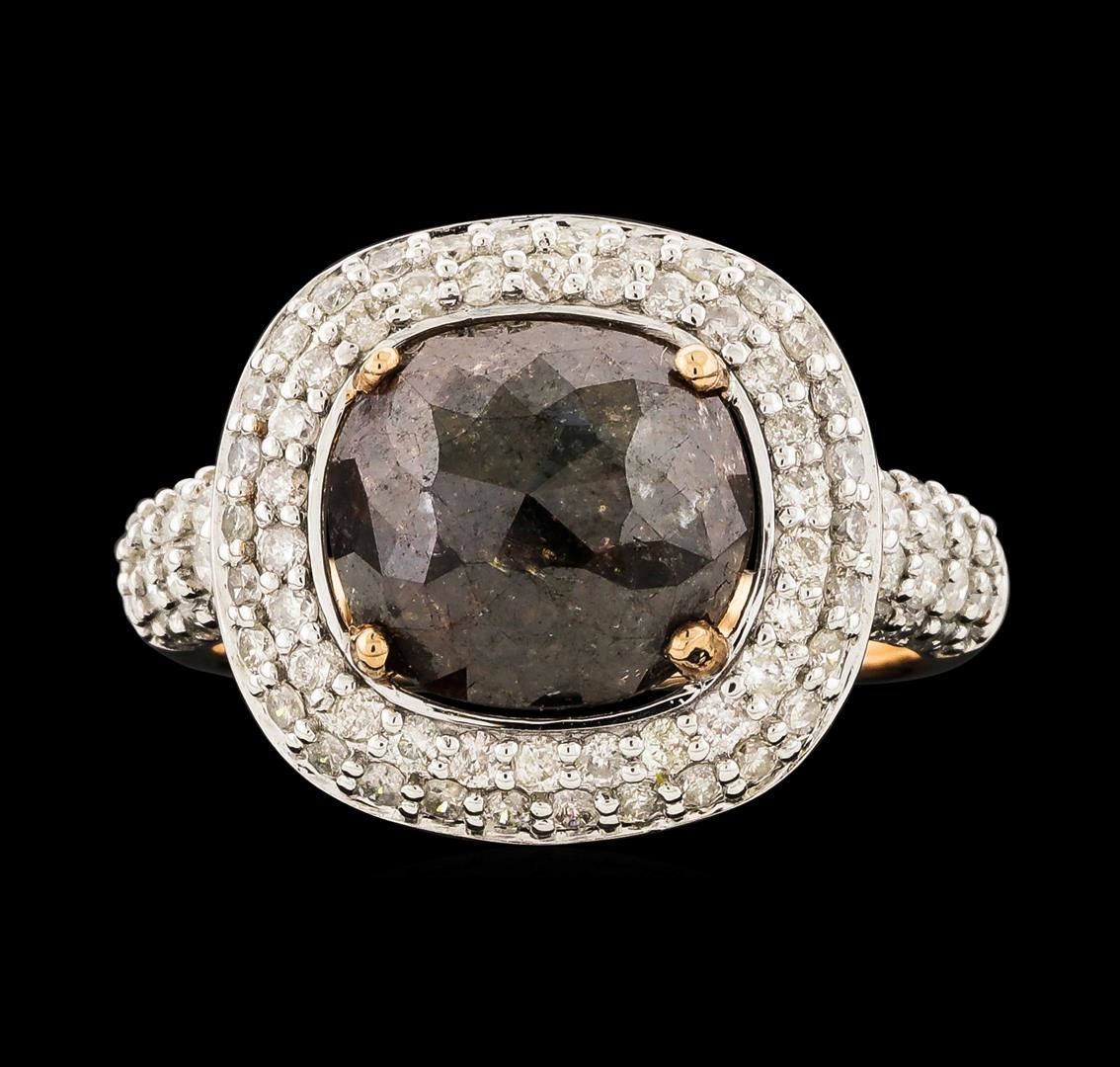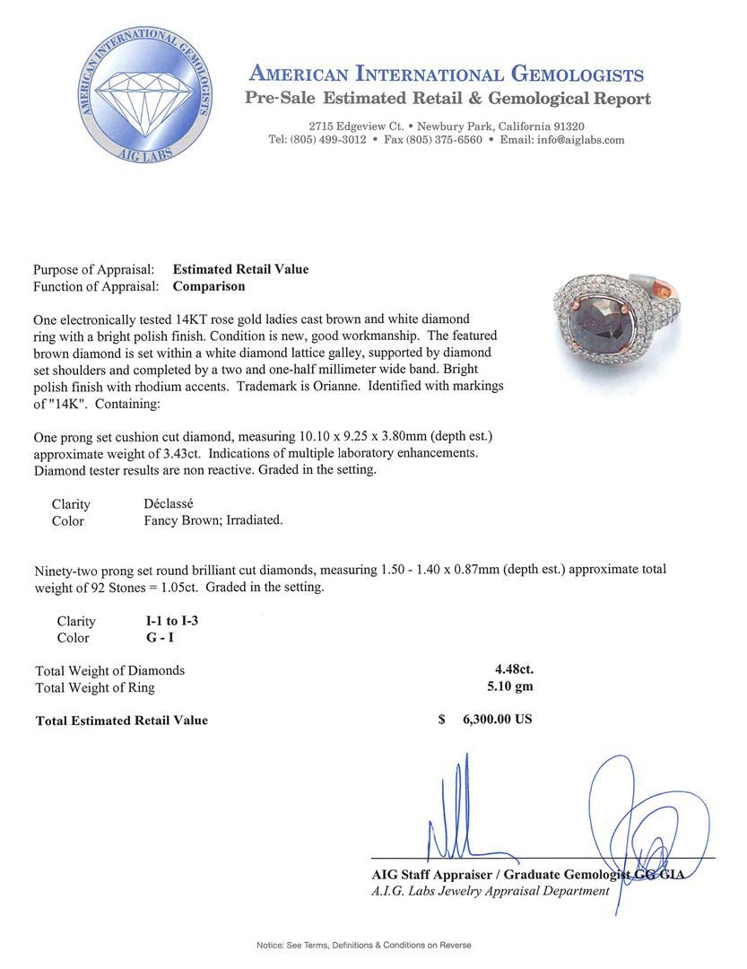 One electronically tested 14KT rose gold ladies cast brown and white diamond ring with a bright polish finish. The featured brown diamond is set within a white diamond lattice galley, supported by diamond set shoulders and completed by a two and one-half millimeter wide band. Bright polish finish with rhodium accents. Trademark is Orianne. Identified with markings of "14K". Condition is new, good workmanship. Containing: One prong set cushion cut diamond, measuring 10.10 x 9.25 x 3.80mm (depth est.) approximate weight of 3.43ct. Indications of multiple laboratory enhancements. Diamond tester results are non reactive. Graded in the setting. Clarity D‚class‚. Color: Fancy Brown; Irradiated. Ninety-Two prong set round brilliant cut diamonds, measuring 1.50 - 1.40 x 0.87mm (depth est.) approximate total weight of 92 Stones = 1.05ct. Graded in the setting. Clarity: I-1 to I-3. Color: G - I. Total Weight of Diamonds 4.48ct. Total Weight of Ring 5.10gm. AIG Appraised at $6,300.00.