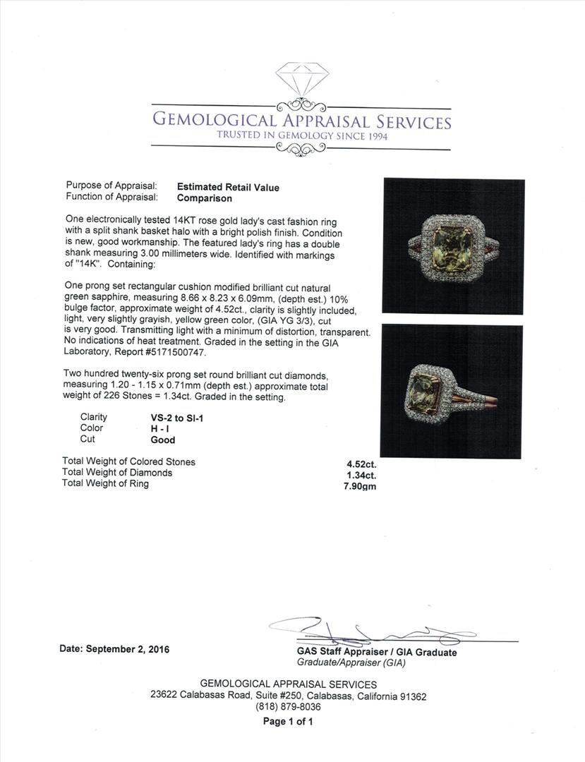 One electronically tested 14KT rose gold lady's cast fashion ring with a split shank basket halo with a bright polish finish. The featured lady's ring has a double shank measuring 3.00 millimeters wide. Identified with markings of "14K". Condition is new, good workmanship. Containing: One prong set rectangular cushion modified brilliant cut natural green sapphire, measuring 8.66 x 8.23 x 6.09mm, (depth est.) 10%. bulge factor, approximate weight of 4.52ct., clarity is slightly included, light, very slightly grayish, yellow green color, (GIA YG 3/3), cut is very good. Transmitting light with a minimum of distortion, transparent. No indications of heat treatment. Graded in the setting in the GIA Laboratory, Report #5171500747.Two Hundred Twenty-Six prong set round brilliant cut diamonds, measuring 1.20 - 1.15 x 0.71mm (depth est.) approximate total weight of 226 Stones = 1.34ct. Graded in the setting. Clarity: VS-2 to SI-1. Color: H - ICut Good. Total Weight of Colored Stones 4.52ct. Total Weight of Diamonds 1.34ct. Total Weight of Ring 7.90gm. GAS Appraised.
