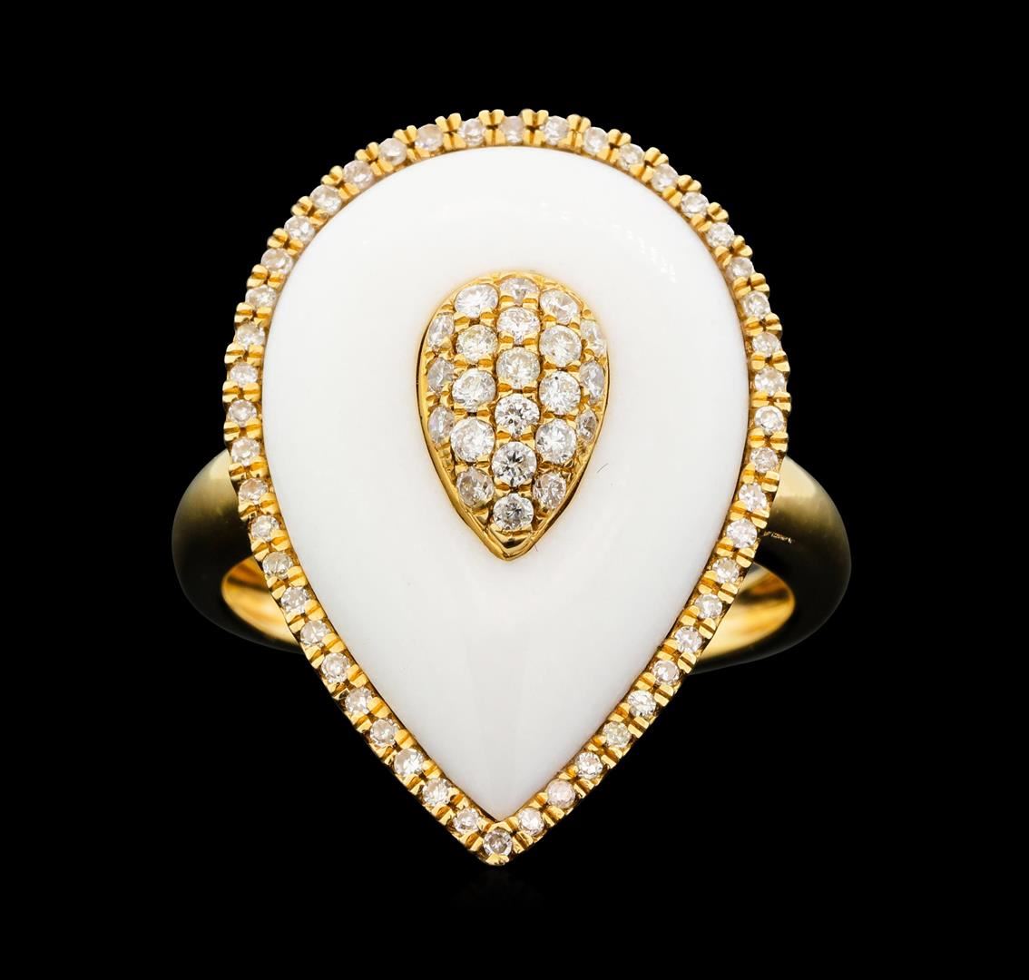 One lady's ring featuring: 14KT rose gold weighing 5.6 grams containing one inlaid white onyx weighing 4.56ct and seventy-two diamonds weighing 0.44ctw.