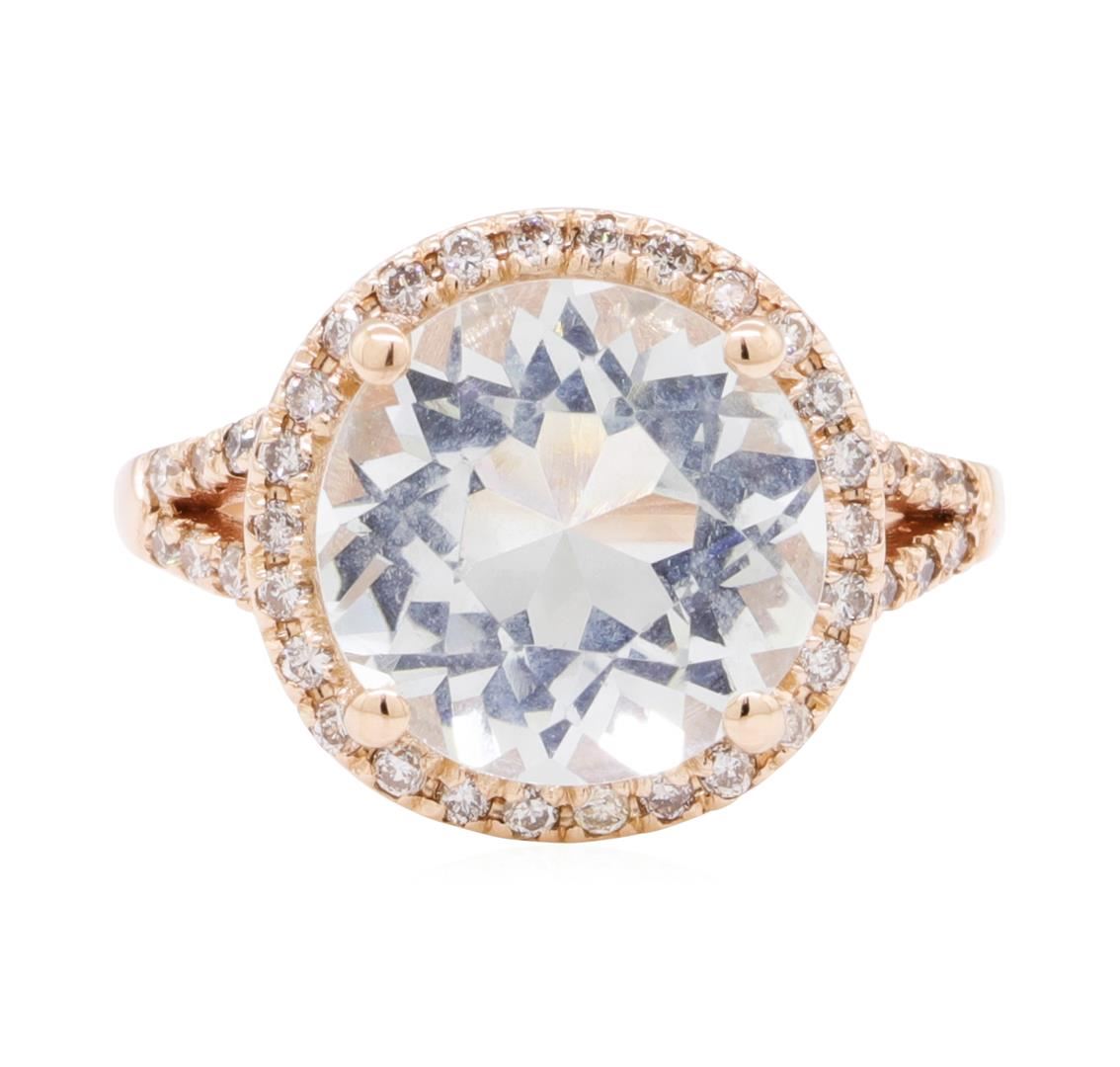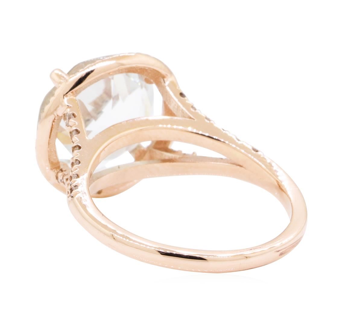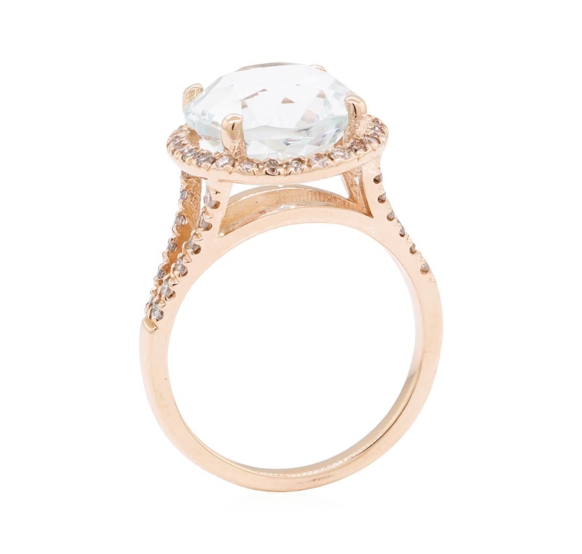 One electronically tested 14KT rose gold lady's cast fashion ring with a split cathedral shank with a halo with a bright polish finish. The featured lady's ring has a shank measuring 1.65 millimeters wide. Identified with markings of '14K'. Condition is new, good workmanship. Containing: One prong set round modified brilliant cut natural aquamarine, measuring 10.95 - 10.90 x 7.30 mm, (depth est.) 5%. bulge factor, approximate weight of 5.00ct.,, Clarity is eye clean, medium light, moderately strong, very slightly greenish blue color, (GIA vslgB 4/4), cut is very good. Transmitting light with no distortion, transparent. Colored gemstones are presumed to have been subjected to commonly used enhancement processes. Graded in the setting. Fifty prong set round brilliant cut diamonds, measuring 1.30 - 1.25 x 0.79mm (depth est.) approximate total weight of 50 Stones = 0.40ct. Graded in the setting. Color H - I, Clarity SI-1 to I-1, Cut Good. Total Weight of Colored Stones 5.00ct. Total Weight of Diamonds 0.40ct. Total Weight of Ring 4.20gm. GAS Appraised.