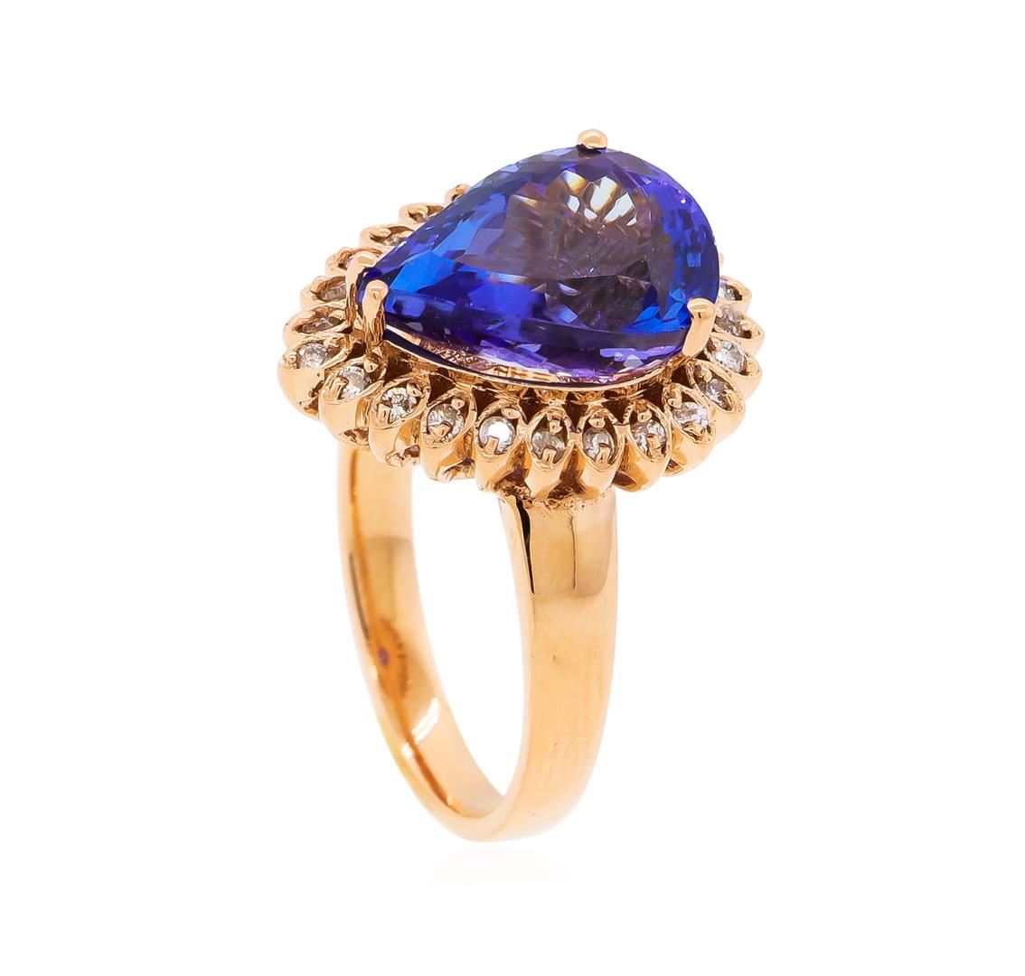 One electronically tested 14KT rose gold lady's cast fashion ring with a basket halo with a bright polish finish. The featured lady's ring has a shank measuring 2.60 millimeters wide. Identified with markings of "K14". Condition is new, good workmanship. Containing: One prong set pear modified brilliant cut natural tanzanite, measuring 13.60 x 9.87 x 7.27mm, approximate weight of 6.14ct., clarity is eye clean, type I, medium dark, moderately strong, violetish blue color, (GIA vB 6/4), cut is very good. Transmitting light with no distortion, transparent. Colored gemstones are presumed to have been subjected to commonly used enhancement processes. Graded in the setting. Twenty-Four prong set round brilliant cut diamonds, measuring 1.40 - 1.30 x 0.84mm (depth est.) approximate total weight of 24 Stones = 0.22ct. Graded in the setting. Clarity: SI-1 to SI-2. Color: H - I, Cut Good. Total Weight of Colored Stones 6.14ct. Total Weight of Diamonds 0.22ct. Total Weight of Ring 7.40gm. GAS Appraised at $12,240.00.