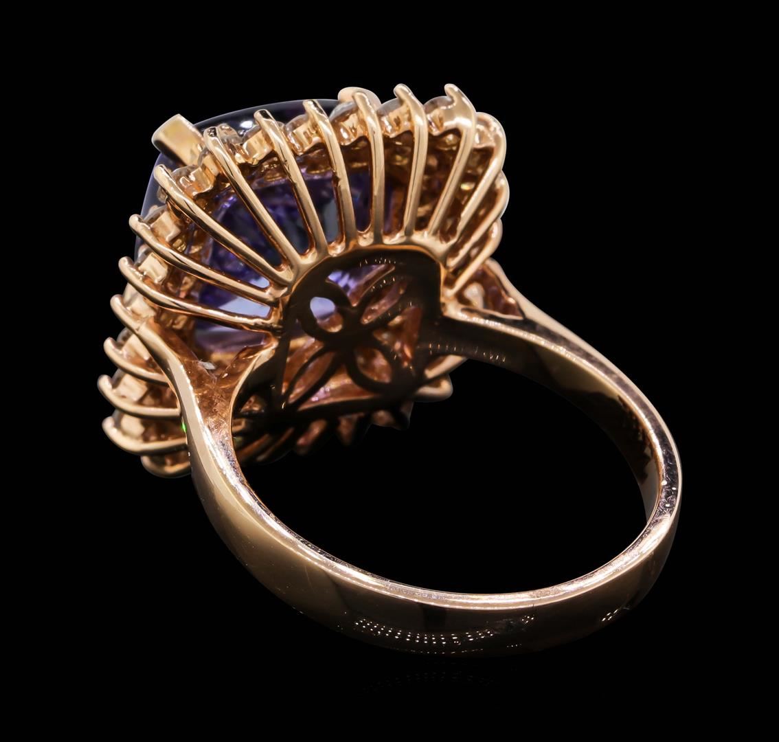 One electronically tested 14KT rose gold lady's cast fashion ring with a square cushion double basket halo with a bright polish finish. The featured lady's ring has a shank measuring 2.90 millimeters wide. Identified with markings of "K14". Condition is new, good workmanship. Containing: One prong set square cushion modified brilliant cut natural tanzanite, measuring 10.18 x 10.10 x 8.50mm, (depth est.) 5%. bulge factor, approximate weight of 7.37ct., clarity is eye clean, medium light, moderately strong, bluish violet color, (GIA bV 4/4), cut is very good. Transmitting light with no distortion, transparent. Colored gemstones are presumed to have been subjected to commonly used enhancement processes. Graded in the setting. Twenty-Six prong set round brilliant cut diamonds, measuring 2.20 - 2.15 x 1.35mm (depth est.) approximate total weight of 26 Stones = 1.01ct. Graded in the setting. Clarity: SI-1 to I-1. Color: H - ICut Good Twenty-Two prong set round brilliant cut diamonds, measuring 1.70 - 1.60 x 0.99mm (depth est.) approximate total weight of 22 Stones = 0.35ct. Graded in the setting. Clarity: SI-2 to I-1. Color: H - ICut Good. Total Weight of Colored Stones 7.37ct. Total Weight of Diamonds 1.36ct. Total Weight of Ring 8.10gm. GAS Appraised at $9,675.00.