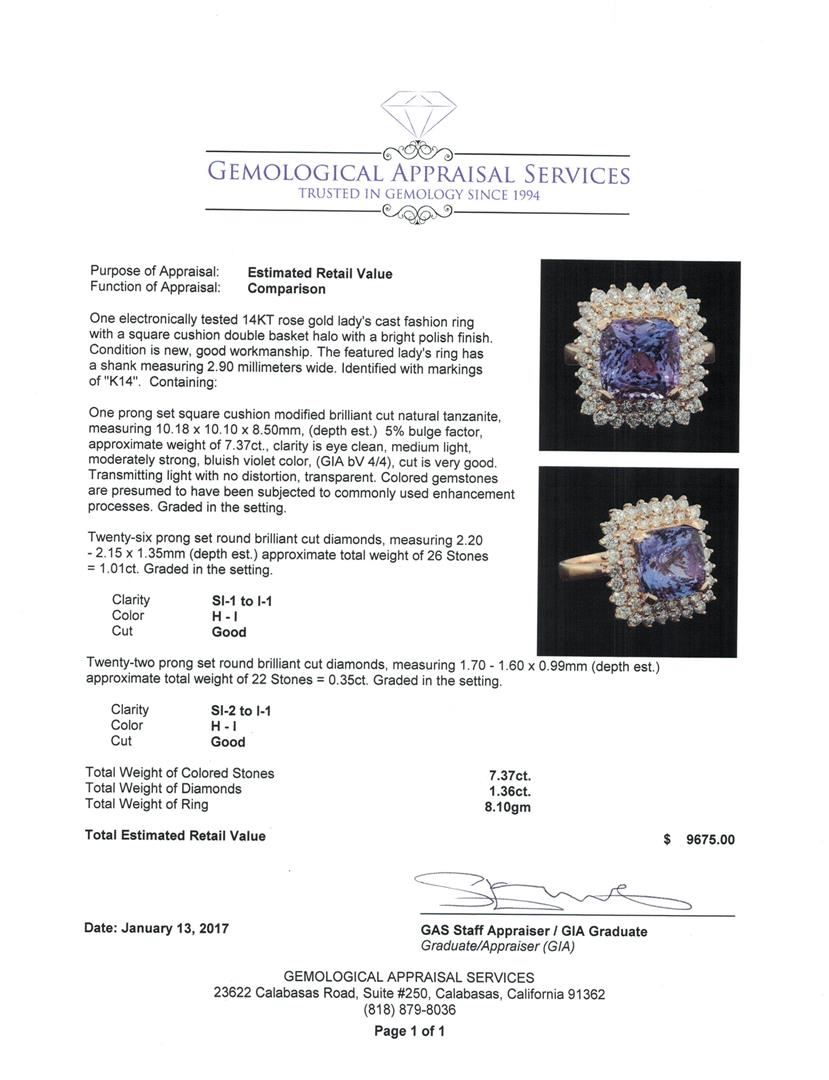 One electronically tested 14KT rose gold lady's cast fashion ring with a square cushion double basket halo with a bright polish finish. The featured lady's ring has a shank measuring 2.90 millimeters wide. Identified with markings of "K14". Condition is new, good workmanship. Containing: One prong set square cushion modified brilliant cut natural tanzanite, measuring 10.18 x 10.10 x 8.50mm, (depth est.) 5%. bulge factor, approximate weight of 7.37ct., clarity is eye clean, medium light, moderately strong, bluish violet color, (GIA bV 4/4), cut is very good. Transmitting light with no distortion, transparent. Colored gemstones are presumed to have been subjected to commonly used enhancement processes. Graded in the setting. Twenty-Six prong set round brilliant cut diamonds, measuring 2.20 - 2.15 x 1.35mm (depth est.) approximate total weight of 26 Stones = 1.01ct. Graded in the setting. Clarity: SI-1 to I-1. Color: H - ICut Good Twenty-Two prong set round brilliant cut diamonds, measuring 1.70 - 1.60 x 0.99mm (depth est.) approximate total weight of 22 Stones = 0.35ct. Graded in the setting. Clarity: SI-2 to I-1. Color: H - ICut Good. Total Weight of Colored Stones 7.37ct. Total Weight of Diamonds 1.36ct. Total Weight of Ring 8.10gm. GAS Appraised at $9,675.00.