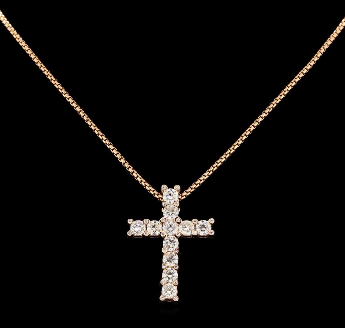 One electronically tested 14KT rose gold unisex combination cast & assembled fashion cross pendant & chain 25.0" long, 2.40mm round box link with a lobster claw clasp with a bright polish finish. Identified with markings of "14K". Condition is new, good workmanship. Containing: Eleven prong set round brilliant cut diamonds, measuring 5.78 - 5.65 x 3.55mm (depth est.) approximate total weight of 11 Stones = 7.80ct. Graded in the setting. Color G - JClarity I-1 to I-2 Cut Good Twenty-Four bezel set round brilliant cut diamonds, measuring 1.60 - 1.50 x 0.96mm (depth est.) approximate total weight of 24 Stones = 0.34ct. Graded in the setting. Color H - I Clarity SI-1 to SI-2 Cut Good. Total Weight of Diamonds 8.14ct. Total Weight of Pendant & Chain 26.20gm. GAS Appraised.