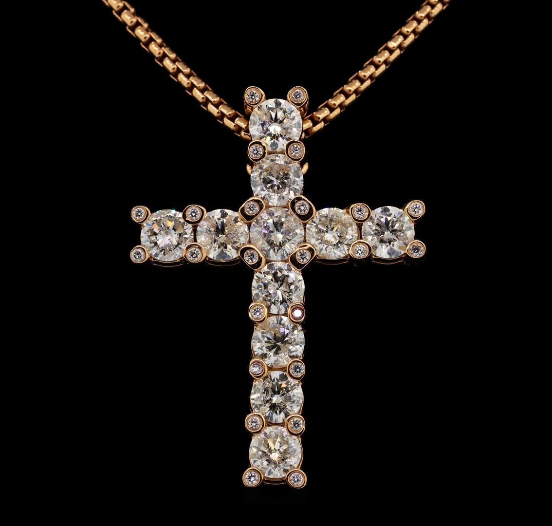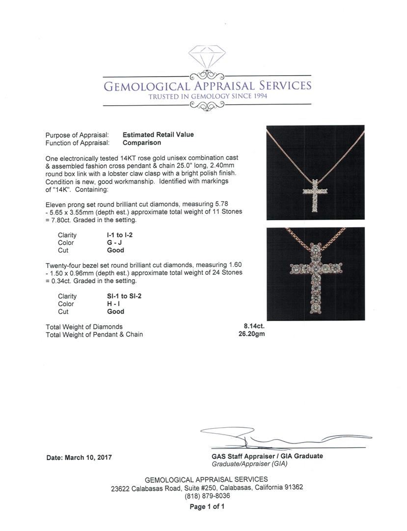 One electronically tested 14KT rose gold unisex combination cast & assembled fashion cross pendant & chain 25.0" long, 2.40mm round box link with a lobster claw clasp with a bright polish finish. Identified with markings of "14K". Condition is new, good workmanship. Containing: Eleven prong set round brilliant cut diamonds, measuring 5.78 - 5.65 x 3.55mm (depth est.) approximate total weight of 11 Stones = 7.80ct. Graded in the setting. Color G - JClarity I-1 to I-2 Cut Good Twenty-Four bezel set round brilliant cut diamonds, measuring 1.60 - 1.50 x 0.96mm (depth est.) approximate total weight of 24 Stones = 0.34ct. Graded in the setting. Color H - I Clarity SI-1 to SI-2 Cut Good. Total Weight of Diamonds 8.14ct. Total Weight of Pendant & Chain 26.20gm. GAS Appraised.