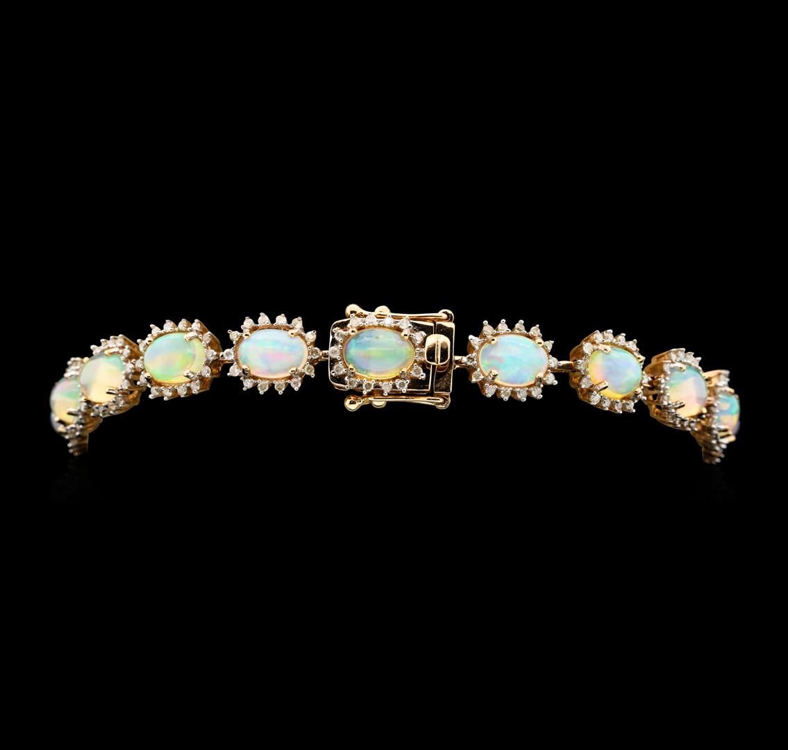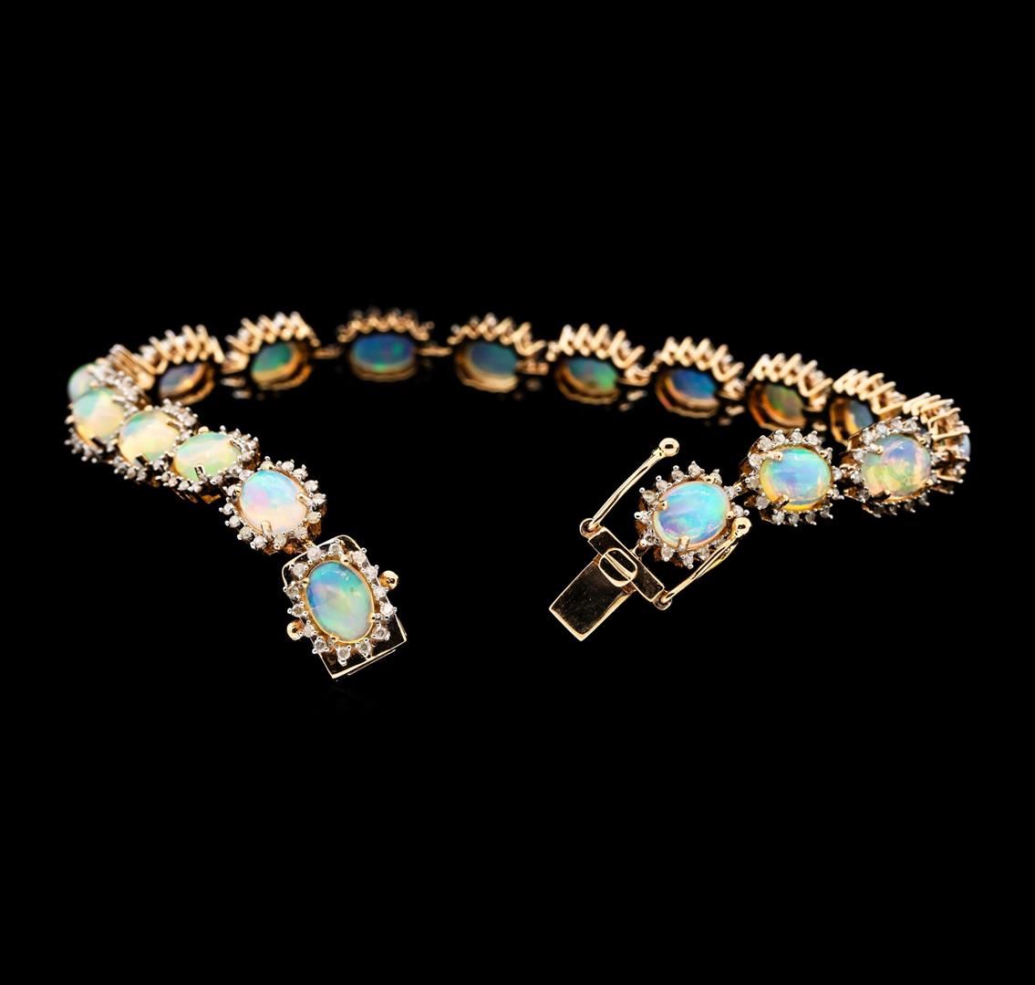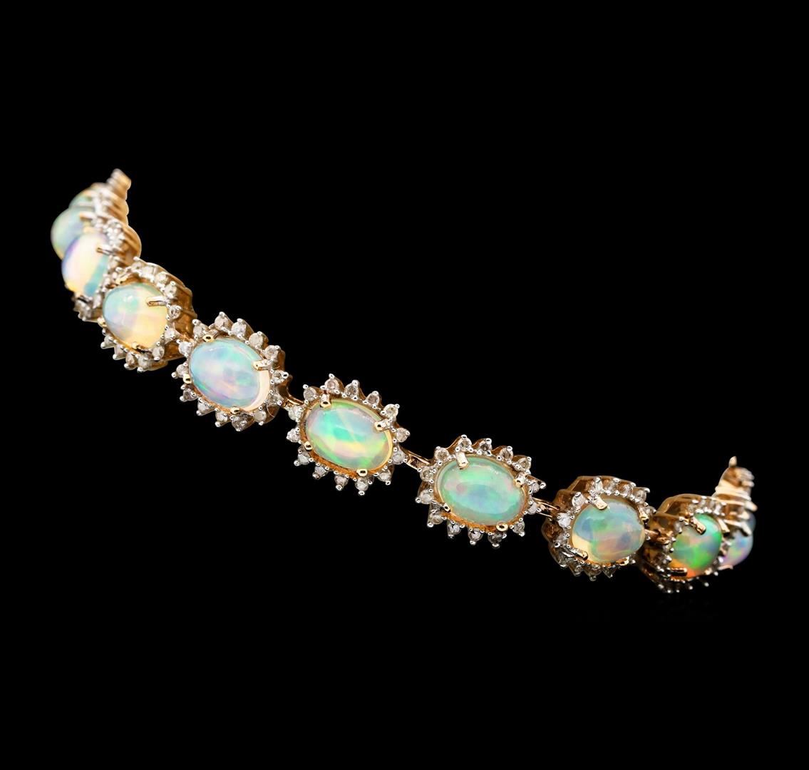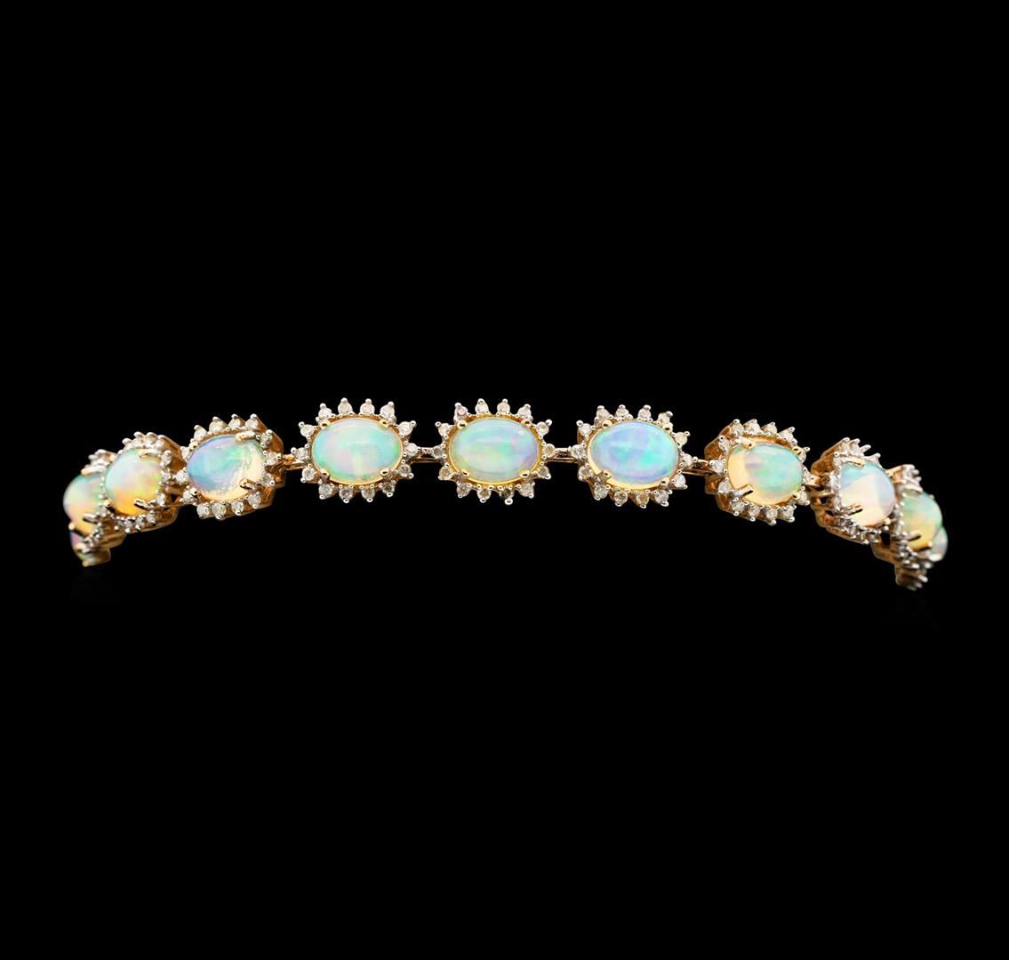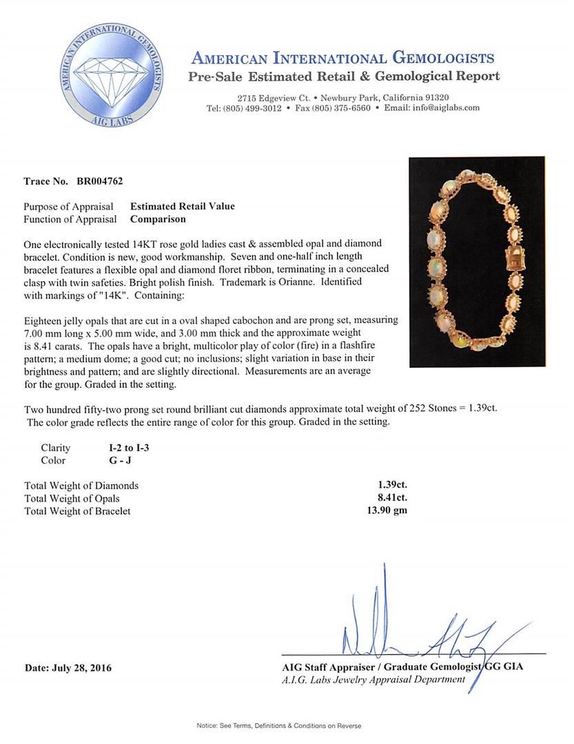 One electronically tested 14KT rose gold ladies cast & assembled opal and diamond bracelet. Seven and one-half inch length bracelet features a flexible opal and diamond floret ribbon, terminating in a concealed clasp with twin safeties. Bright polish finish. Trademark is Orianne. Identified with markings of "14K". Condition is new, good workmanship. Containing: Eighteen jelly opals that are cut in a oval shaped cabochon and are prong set, measuring 7.00 mm long x 5.00 mm wide, and 3.00 mm thick and the approximate weight is 8.41 carats. The opals have a bright, multicolor play of color (fire) in a flashfire pattern; a medium dome; a good cut; no inclusions; slight variation in base in their brightness and pattern; and are slightly directional. Measurements are an average for the group. Graded in the setting. Two Hundred Fifty-Two prong set round brilliant cut diamonds approximate total weight of 252 Stones = 1.39ct. The color grade reflects the entire range of color for this group. Graded in the setting. Clarity: I-2 to I-3. Color: G - J. Total Weight of Diamonds 1.39ct. Total Weight of Opals 8.41ct. Total Weight of Bracelet 13.90gm. AIG Appraised.